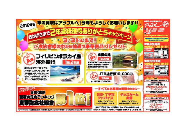 お車のご相談・ 査定だけでもOK! カンタン 入力 30秒 アップルがブランド買取始めました! お電話でも受付中! 受付時間10:00 ~ 19:00 0567-28-8151 お車のご相談・ 査定だけでもOK! カンタン 入力 30秒 アップルがブランド買取始めました! お電話でも受付中! 受付時間10:00 ~ 19:00 0567-28-8151 アップルがブランド買取始めました! お電話でも受付中! 受付時間10:00 ~ 19:00 0567-28-8151 店舗情報 在庫車 スタッフ紹介 ブログ お客様の声 キャンペーン 無料査定 click 最新記事一覧 月別アーカイブ 2026年04月(17)2026年03月(27)2026年02月(24)2026年01月(23)2025年12月(23)2025年11月(27)2025年10月(26)2025年09月(26)2025年08月(21)2025年07月(26)2025年06月(26)2025年05月(21)2025年04月(24)2025年03月(27)2025年02月(24)2025年01月(23)2024年12月(23)2024年11月(26)2024年10月(26)2024年09月(26)2024年08月(21)2024年07月(26)2024年06月(26)2024年05月(23)2024年04月(22)2024年03月(27)2024年02月(25)2024年01月(23)2023年12月(23)2023年11月(25)2023年10月(27)2023年09月(26)2023年08月(21)2023年07月(27)2023年06月(26)2023年05月(22)2023年04月(25)2023年03月(26)2023年02月(24)2023年01月(25)2022年12月(24)2022年11月(25)2022年10月(27)2022年09月(26)2022年08月(21)2022年07月(27)2022年06月(25)2022年05月(22)2022年04月(26)2022年03月(26)2022年02月(24)2022年01月(24)2021年12月(22)2021年11月(26)2021年10月(27)2021年09月(25)2021年08月(22)2021年07月(27)2021年06月(25)2021年05月(23)2021年04月(25)2021年03月(26)2021年02月(24)2021年01月(23)2020年12月(23)2020年11月(26)2020年10月(27)2020年09月(24)2020年08月(22)2020年07月(24)2020年06月(25)2020年05月(21)2020年04月(23)2020年03月(26)2020年02月(24)2020年01月(22)2019年12月(21)2019年11月(24)2019年10月(24)2019年09月(22)2019年08月(19)2019年07月(16)2019年06月(18)2019年05月(16)2019年04月(9)2019年03月(4)2019年02月(6)2019年01月(2)2018年12月(3)2018年11月(4)2018年10月(21)2018年09月(25)2018年08月(22)2018年07月(27)2018年06月(24)2018年05月(23)2018年04月(25)2018年03月(27)2018年02月(22)2018年01月(24)2017年12月(23)2017年11月(23)2017年10月(22)2017年09月(23)2017年08月(21)2017年07月(18)2017年06月(12)2017年05月(10)2017年04月(10)2017年03月(7)2017年02月(8)2017年01月(12)2016年12月(12)2016年11月(12)2016年10月(10)2016年09月(17)2016年08月(19)2016年07月(21)2016年06月(5)2016年05月(6)2016年04月(4)2016年03月(4)2016年02月(3)2016年01月(6)2015年12月(6)2015年11月(6)2015年10月(7)2015年09月(8)2015年08月(8)2015年07月(7)2015年06月(6)2015年05月(6)2015年04月(6)2015年03月(6)2015年02月(4)2015年01月(7)2014年12月(7)2014年11月(5)2014年10月(6)2014年09月(8)2014年08月(10)2014年07月(9)2014年06月(12)2014年05月(13)2014年04月(8)2014年03月(3)2014年02月(4)2014年01月(4)2013年12月(4)2013年11月(5)2013年10月(4)2013年09月(2)2013年08月(1) 2581-2590/2773件中 [ 未分類 ] 2016/03/14(月) 09:56 ☆愉しい小旅行☆ 皆様こんにちは!!山口です☆彡いつも当店のブログをご覧頂きありがとうございます!一昨日と昨日の土日も沢山のお客様にご来店頂きました!沢山の笑顔との出会いに感謝です(*´ω`*)当店を選んで頂きありがとうございます!!さて、今回は店長とアップルの仲間たちと先日行った小旅… [ 未分類 ] 2016/03/08(火) 09:59 ☆癒し☆ 皆様こんにちは!!いつも当店のブログをご覧頂きありがとうございます!!昨日も沢山のご来店に感謝致します!!本日も元気に営業中ですよ!!今日は朝一番で汚れてしまっていた水槽を掃除して綺麗にしました(●´ω`●)水草もおNEWにして一段と見栄えよくなりました(*&acut… [ 未分類 ] 2016/02/22(月) 09:58 ☆イメチェン☆ 皆様こんにちは!!山――――ザ!参上ですわよ!シャーーーーっス!いつも当店のブログをご覧頂きありがとうございます!!昨日は一日中絶えることなく沢山のお客様にご来店頂きました!!数多くの素敵な出会いに心より感謝です(*´ω`*)本日も元気に営業しておりますよ♪さて、最近… [ 未分類 ] 2016/02/15(月) 11:37 ☆ハッピーバレンタイン☆ 皆様こんにちは!本日は天気良いですが、風が強いですね(/ω\)久々の登場!花粉の到来に怯えています山口です(*^▽^*)昨日はバレンタインデーでしたね★☆★何と!店長が私たちの為にプレゼントを用意してくれました!!思わぬサプライズに感動(/ω\)「ハッピーバレンタイン… [ 未分類 ] 2016/02/09(火) 10:23 ☆めんたいこ~☆ ブログをご覧の皆様!おはようございます!ニコニコスマイルメガネの山田です!今日はあいにくの曇り空。雨も降ったり止んだりしています。お車の運転の際には十分にお気を付けください☆さて、突然ですが!皆様ご飯のお供といえば何を思い浮かべますか?ごはんですよ!とか、鮭フレークとか、のりたまとか美味しい… [ 未分類 ] 2016/01/30(土) 12:34 ☆穴場☆ ブログをご覧の皆様、こんにちは!ニコニコスマイルメガネの山田です!土曜日の昼下がり、いかがお過ごしでしょうか(*^^*)?アップル津島店は今日も明るく元気に営業中!!お車ご売却のご相談は、ぜひともアップル津島中央道店にお声掛けください!さて!前回に引き続き、今回もグルメネタでお届けします!今… [ 未分類 ] 2016/01/24(日) 13:16 ☆ヒッコリー☆ 皆様こんにちは!急激に寒くなりましたね!携帯が着信した時くらい常時ブルブル震えております。(+o+)寒いのが大の苦手で着込みまくり!ニコニコスマ