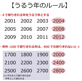 お車のご相談・ 査定だけでもOK! カンタン 入力 30秒 アップルがブランド買取始めました! お電話でも受付中! 受付時間10:00 ~ 19:00 0567-28-8151 お車のご相談・ 査定だけでもOK! カンタン 入力 30秒 アップルがブランド買取始めました! お電話でも受付中! 受付時間10:00 ~ 19:00 0567-28-8151 アップルがブランド買取始めました! お電話でも受付中! 受付時間10:00 ~ 19:00 0567-28-8151 店舗情報 在庫車 スタッフ紹介 ブログ お客様の声 キャンペーン 無料査定 click [ 未分類 ] 2024/02/29 (木) 10:30 「うるう年」の「うるう」って漢字で書けますか??? アップル津島中央道店のブログをご覧の皆様 こんにちは アドバイザーの齋藤です( *´艸`) 今日はビミョーな曇り空 夕方から雨が降るそうです・・・ 寒暖差もまだまだあります! 体調管理には十分に 気を付けて参りましょう! さて 本日は 2/29 (Webより) 4年に一度? やってくる 「閏年」 そもそも閏年って何?・・・。アロエリーナに聞いてみよっ!!!!ご存じの方は音楽に合わせて~♪せ~~~~~のっ (Webより) 「聞いてアロエリーナ」 「ちょっと言いにくいんだけど」 「聞いてアロエリーナ」 「うるう年ってなに~~~~~?」(昔のCMより) 調べたところ・・・ 太陽が黄道を1周する周期が1年間。 これは約365.242189日(2015年時点)かかります。 1年というと365日と思ってしまいますが、 実際には太陽の動きと暦には差があるのです。 この差を調整するのがうるう年です。(ネットより) はい。 チンプンカンプン(*’ω’*) とにかく 400で割り切れるかどうか? (Webより) ちなみに・・・ 2/29日の誕生日の方は 29日がない時は 2/28日が誕生日になるそうですよ~ まぁ不思議( *´艸`) プチ情報でしたっ! 以上 齋藤でしたっ! ☆★お知らせ★☆3/31(日)まで春のトクトクキャンペーン開催中です(*´▽`*)期間中にご成約頂いた方の中から抽選で豪華景品が当たります♪当選人数は過去最高の2,725名様!!詳しくはHPのキャンペーン情報をご覧下さいm(__)mこの機会に是非! 2024-02-29 10:30:30 新しい記事へ 古い記事へ 最新記事 おしらせ!いっぱいとれるってよ!?~ハイウェイの堕天使~ぬま~沼~~名作フラペチーノ~ 店舗情報に戻る 月別アーカイブ 2026年04月(17)2026年03月(27)2026年02月(24)2026年01月(23)2025年12月(23)2025年11月(27)2025年10月(26)2025年09月(26)2025年08月(21)2025年07月(26)2025年06月(26)2025年05月(21)2025年04月(24)2025年03月(27)2025年02月(24)2025年01月(23)2024年12月(23)2024年11月(26)2024年10月(26)2024年09月(26)2024年08月(21)2024年07月(26)2024年06月(26)2024年05月(23)2024年04月(22)2024年03月(27)2024年02月(25)2024年01月(23)2023年12月(23)2023年11月(25)2023年10月(27)2023年09月(26)2023年08月(21)2023年07月(27)2023年06月(26)2023年05月(22)2023年04月(25)2023年03月(26)2023年02月(24)2023年01月(25)2022年12月(24)2022年11月(25)2022年10月(27)2022年09月(26)2022年08月(21)2022年07月(27)2022年06月(25)2022年05月(22)2022年04月(26)2022年03月(26)2022年02月(24)2022年01月(24)2021年12月(22)2021年11月(26)2021年10月(27)2021年09月(25)2021年08月(22)2021年07月(27)2021年06月(25)2021年05月(23)2021年04月(25)2021年03月(26)2021年02月(24)2021年01月(23)2020年12月(23)2020年11月(26)2020年10月(27)2020年09月(24)2020年08月(22)2020年07月(24)2020年06月(25)2020年05月(21)2020年04月(23)2020年03月(26)2020年02月(24)2020年01月(22)2019年12月(21)2019年11月(24)2019年10月(24)2019年09月(22)2019年08月(19)2019年07月(16)2019年06月(18)2019年05月(16)2019年04月(9)2019年03月(4)2019年02月(6)2019年01月(2)2018年12月(3)2018年11月(4)2018年10月(21)2018年09月(25)2018年08月(22)2018年07月(27)2018年06月(24)2018年05月(23)2018年04月(25)2018年03月(27)2018年02月(22)2018年01月(24)2017年12月(23)2017年11月(23)2017年10月(22)2017年09月(23)2017年08月(21)2017年07月(18)2017年06月(12)2017年05月(10)2017年04月(10)2017年03月(7)2017年02月(8)2017年01月(12)2016年12月(12)2016年11月(12)2016年10月(10)2016年09月(17)2016年08月(19)2016年07月(21)2016年06月(5)2016年05月(6)2016年04月(4)2016年03月(4)2016年02月(3)2016年01月(6)2015年12月(6)2015年11月(6)2015年10月(7)2015年09月(8)2015年08月(8)2015年07月(7)2015年06月(6)2015年05月(6)2015年04月(6)2015年03月(6)2015年02月(4)2015年01月(7)2014年12月(7)2014年11月(5)2014年10月(6)2014年09月(8)2014年08月(10)2014年07月(9)2014年06月(12)2014年05月(13)2014年04月(8)2014年03月(3)2014年02月(4)2014年01月(4)2013年12月(4)2013年11月(5)2013年10月(4)2013年09月(2)2013年08月(1)