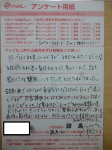 、店長藤原さんはじめスタッフの方の対応の良さがとても印象的だったので多少の金額の差だったので、アップルさんに買取をおねがいしました。最後の最後までかわらない対応のよさでとても気持ち良かったです。ありがとうございました。