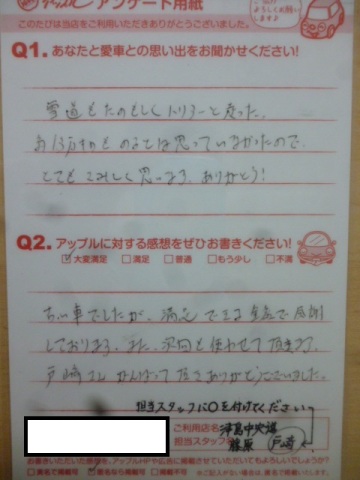 古い車でしたが、満足できる金額で感謝しております。また、次回も使わせて頂きます。戸崎さんがんばって頂きありがとうございました。