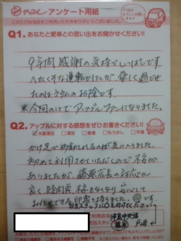 9年間感謝の気持ちでいっぱいです。へたくそな運転でしたが楽しく過ごせたのはラウムのお陰です。