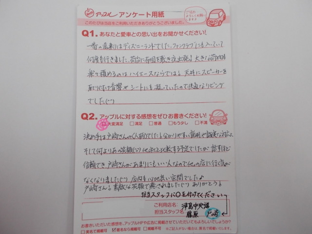 決め手は戸崎さんの人柄でした!分かりやすい説明や誠実な対応、そして何よりあの笑顔(^◇^)他社と比較する予定でしたが話すほど信頼でき、戸崎さんがあまりにもいい人なので他の店に行く気がなくなりました(^^)店内も心地よい空間でした♪戸崎さん!素敵な笑顔で癒されました(^^)ありがとう!
