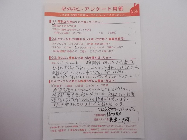 お車のご相談・ 査定だけでもOK! カンタン 入力 30秒 アップルがブランド買取始めました! お電話でも受付中! 受付時間10:00 ~ 19:00 0567-28-8151 お車のご相談・ 査定だけでもOK! カンタン 入力 30秒 アップルがブランド買取始めました! お電話でも受付中! 受付時間10:00 ~ 19:00 0567-28-8151 アップルがブランド買取始めました! お電話でも受付中! 受付時間10:00 ~ 19:00 0567-28-8151 店舗情報 在庫車 スタッフ紹介 ブログ お客様の声 キャンペーン 無料査定 click お客様の声 ご記入日: 2014/04/19 匿名様 希望金額にいかなかったもののとても気持ちのいい接客態度!勉強になりました。他社さんも利用相談しましたがNO1の接客だと思います。また手放すときはよろしくお願いいたします。 前へ 次へ お客様の声一覧を見る