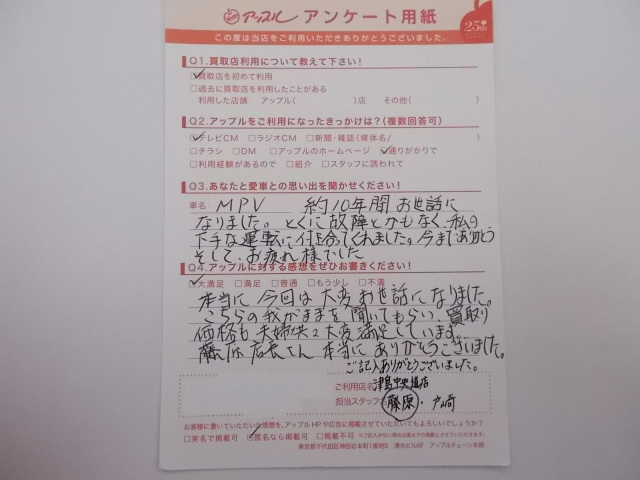 お車のご相談・ 査定だけでもOK! カンタン 入力 30秒 アップルがブランド買取始めました! お電話でも受付中! 受付時間10:00 ~ 19:00 0567-28-8151 お車のご相談・ 査定だけでもOK! カンタン 入力 30秒 アップルがブランド買取始めました! お電話でも受付中! 受付時間10:00 ~ 19:00 0567-28-8151 アップルがブランド買取始めました! お電話でも受付中! 受付時間10:00 ~ 19:00 0567-28-8151 店舗情報 在庫車 スタッフ紹介 ブログ お客様の声 キャンペーン 無料査定 click お客様の声 ご記入日: 2014/04/19 匿名様 本当に今回は大変お世話になりました。こちらの我がままを聞いてもらい買取価格も夫婦共々大変満足しています。藤原店長さん本当に有難うございました。 前へ 次へ お客様の声一覧を見る