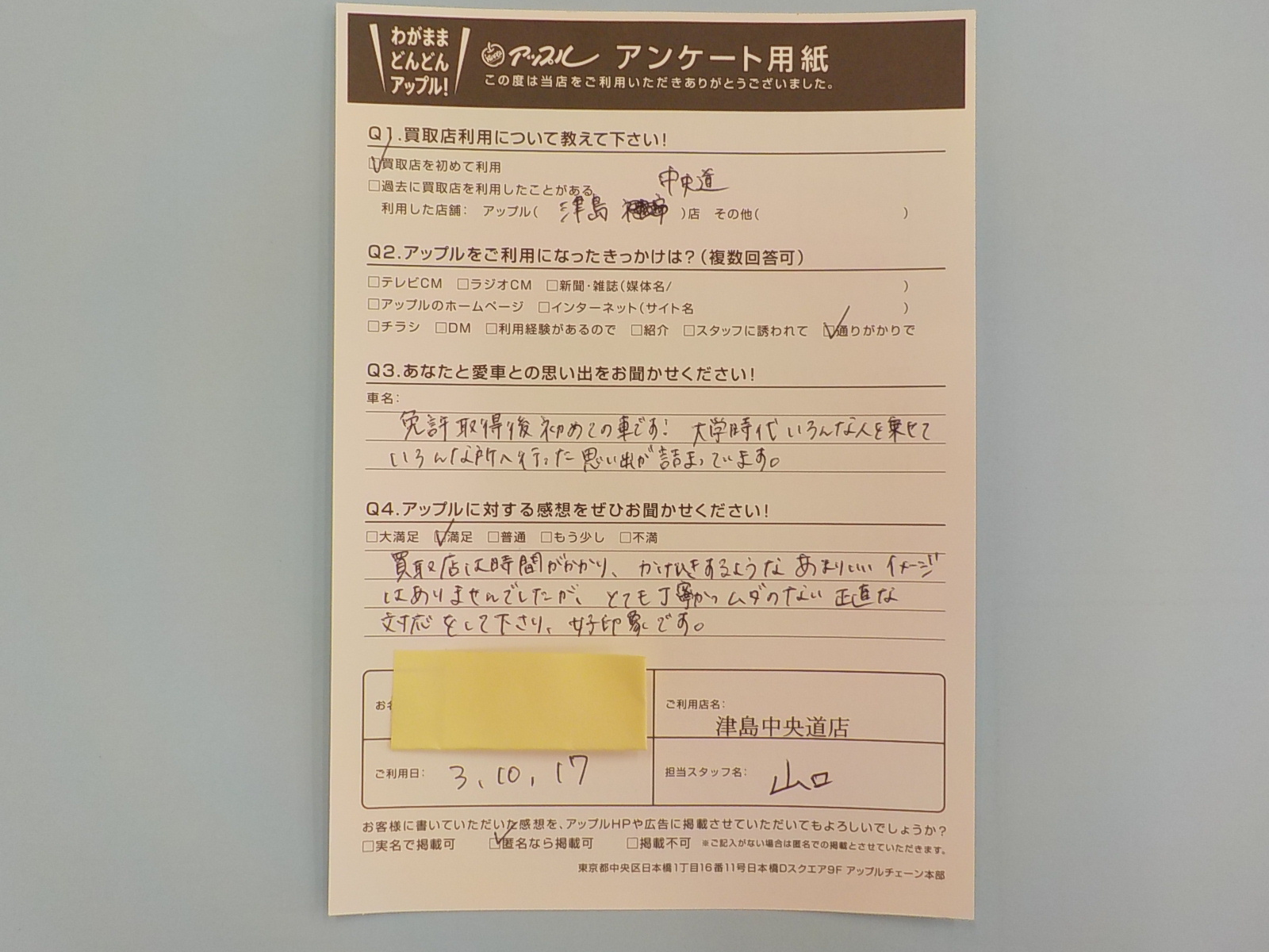 お車のご相談・ 査定だけでもOK! カンタン 入力 30秒 アップルがブランド買取始めました! お電話でも受付中! 受付時間10:00 ~ 19:00 0567-28-8151 お車のご相談・ 査定だけでもOK! カンタン 入力 30秒 アップルがブランド買取始めました! お電話でも受付中! 受付時間10:00 ~ 19:00 0567-28-8151 アップルがブランド買取始めました! お電話でも受付中! 受付時間10:00 ~ 19:00 0567-28-8151 店舗情報 在庫車 スタッフ紹介 ブログ お客様の声 キャンペーン 無料査定 click お客様の声 ご記入日: 2021/10/17 匿名様 車名:三菱 コルト 買取店は時間がかかり、かけひきするようなあまりいいイメージはありませんでしたが、とても丁寧かつムダのない正直な対応をして下さい、好印象です。 前へ 次へ お客様の声一覧を見る