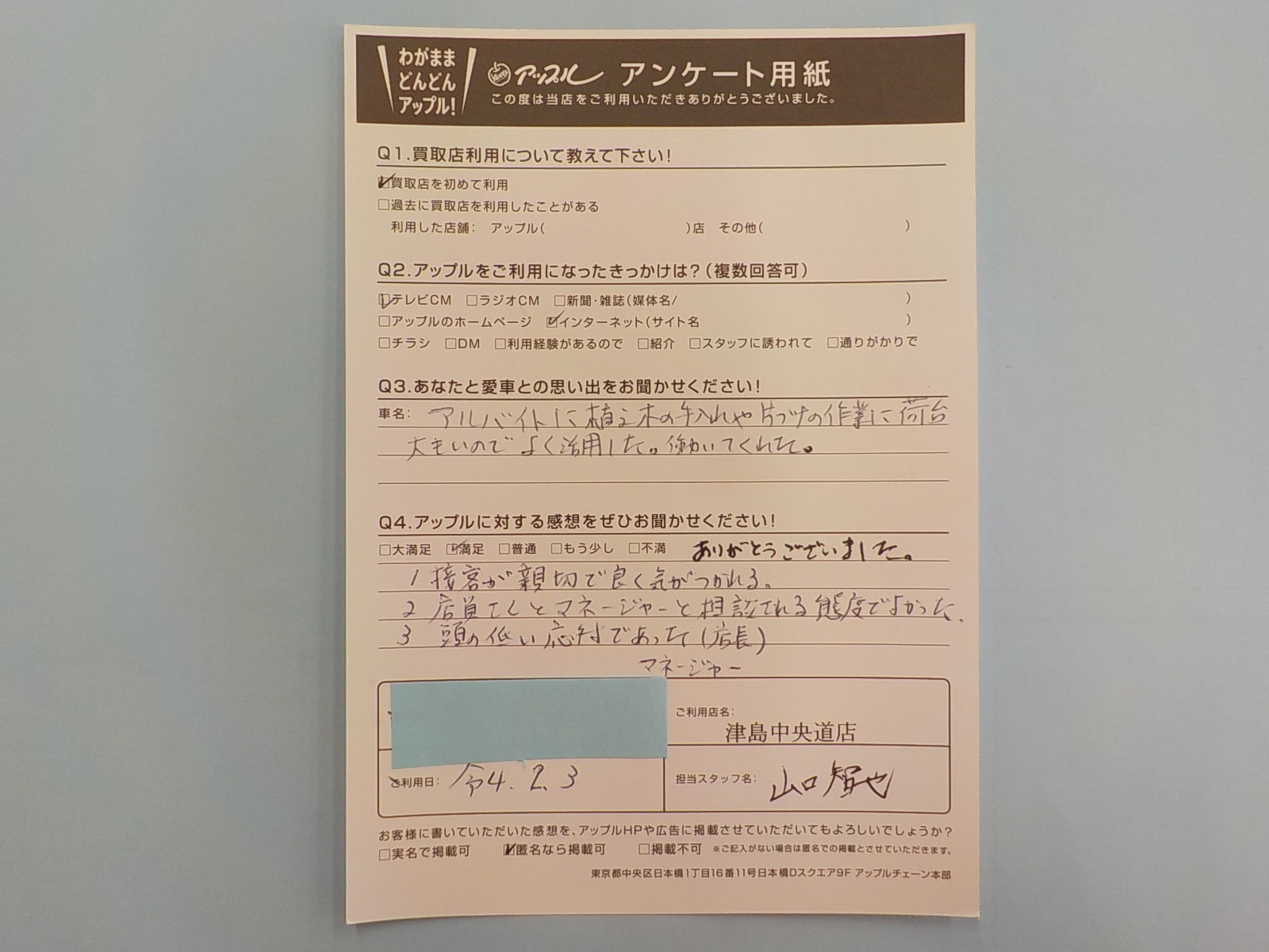 お車のご相談・ 査定だけでもOK! カンタン 入力 30秒 アップルがブランド買取始めました! お電話でも受付中! 受付時間10:00 ~ 19:00 0567-28-8151 お車のご相談・ 査定だけでもOK! カンタン 入力 30秒 アップルがブランド買取始めました! お電話でも受付中! 受付時間10:00 ~ 19:00 0567-28-8151 アップルがブランド買取始めました! お電話でも受付中! 受付時間10:00 ~ 19:00 0567-28-8151 店舗情報 在庫車 スタッフ紹介 ブログ お客様の声 キャンペーン 無料査定 click お客様の声 ご記入日: 2022/02/03 匿名(男性)様 1.接客が親切で良く気がつかれる。2.店員さんとマネージャーと相談される態度でよかった。3.頭の低い応対であった。(店長・マネージャー)ありがとうございました。 前へ 次へ お客様の声一覧を見る