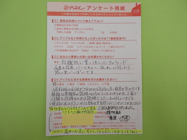 入店する時の応対がさわやかな気持ちの良い接客が良かったです。複雑な書類等の説明の仕方がとてもわかりやすく、丁寧で信頼と説得力のある説明でした。あの忙しい中でも(電話に出られたり)いやな顏せず自然なにこやかさが出ていました。帰りもみえなくなるまで二人で見送って下さって感激しました。こんなに温かいお店に引き取ってもらえたことがとてもうれしい。