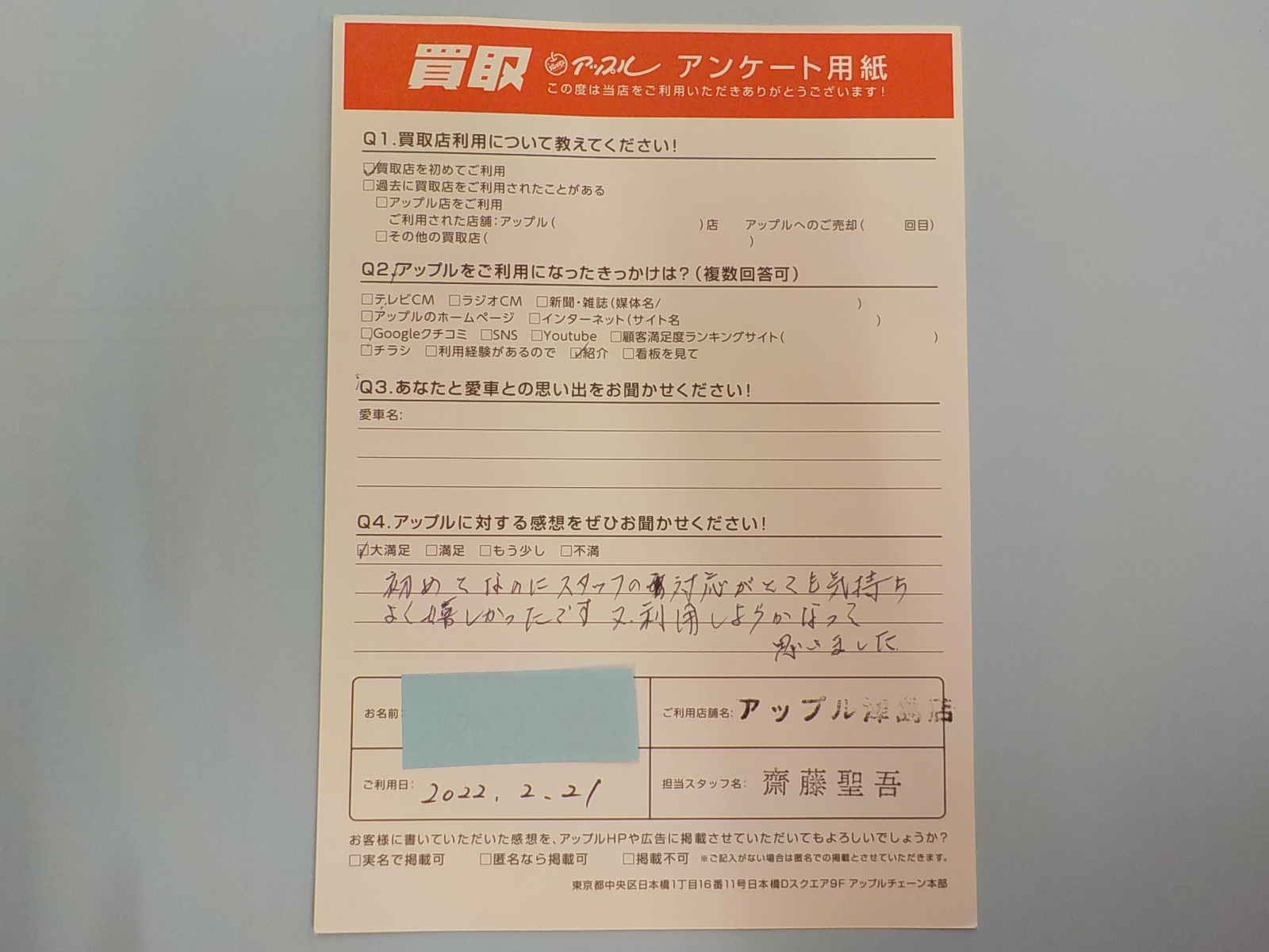 お車のご相談・ 査定だけでもOK! カンタン 入力 30秒 アップルがブランド買取始めました! お電話でも受付中! 受付時間10:00 ~ 19:00 0567-28-8151 お車のご相談・ 査定だけでもOK! カンタン 入力 30秒 アップルがブランド買取始めました! お電話でも受付中! 受付時間10:00 ~ 19:00 0567-28-8151 アップルがブランド買取始めました! お電話でも受付中! 受付時間10:00 ~ 19:00 0567-28-8151 店舗情報 在庫車 スタッフ紹介 ブログ お客様の声 キャンペーン 無料査定 click お客様の声 ご記入日: 2022/02/21 匿名(男性)様 初めてなのにスタッフの対応がとても気持ちよく嬉しかったです。又、利用しようかなって思いました。 前へ 次へ お客様の声一覧を見る