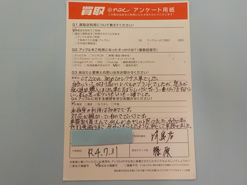 匿名(男性)様 車名:レクサス CT (国内仕様 右H)