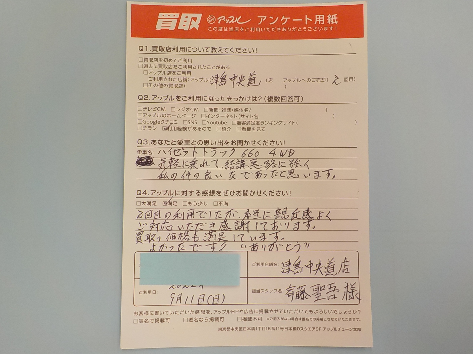 お車のご相談・ 査定だけでもOK! カンタン 入力 30秒 アップルがブランド買取始めました! お電話でも受付中! 受付時間10:00 ~ 19:00 0567-28-8151 お車のご相談・ 査定だけでもOK! カンタン 入力 30秒 アップルがブランド買取始めました! お電話でも受付中! 受付時間10:00 ~ 19:00 0567-28-8151 アップルがブランド買取始めました! お電話でも受付中! 受付時間10:00 ~ 19:00 0567-28-8151 店舗情報 在庫車 スタッフ紹介 ブログ お客様の声 キャンペーン 無料査定 click お客様の声 ご記入日: 2022/09/11 匿名(男性)様 車名:ダイハツ ハイゼットトラック(H11年1月~) 2回目の利用でしたが、本当に親近感よくご対応いただき感謝しております。買取り価格も満足しています。よかったです!! "ありがとう" 前へ 次へ お客様の声一覧を見る