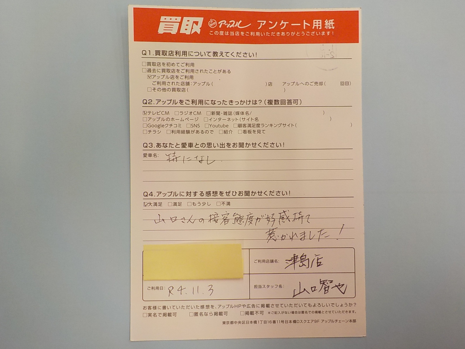 お車のご相談・ 査定だけでもOK! カンタン 入力 30秒 アップルがブランド買取始めました! お電話でも受付中! 受付時間10:00 ~ 19:00 0567-28-8151 お車のご相談・ 査定だけでもOK! カンタン 入力 30秒 アップルがブランド買取始めました! お電話でも受付中! 受付時間10:00 ~ 19:00 0567-28-8151 アップルがブランド買取始めました! お電話でも受付中! 受付時間10:00 ~ 19:00 0567-28-8151 店舗情報 在庫車 スタッフ紹介 ブログ お客様の声 キャンペーン 無料査定 click お客様の声 ご記入日: 2022/11/03 匿名(男性)様 山口さんの接客対応が好感持て、惹かれました! 前へ 次へ お客様の声一覧を見る