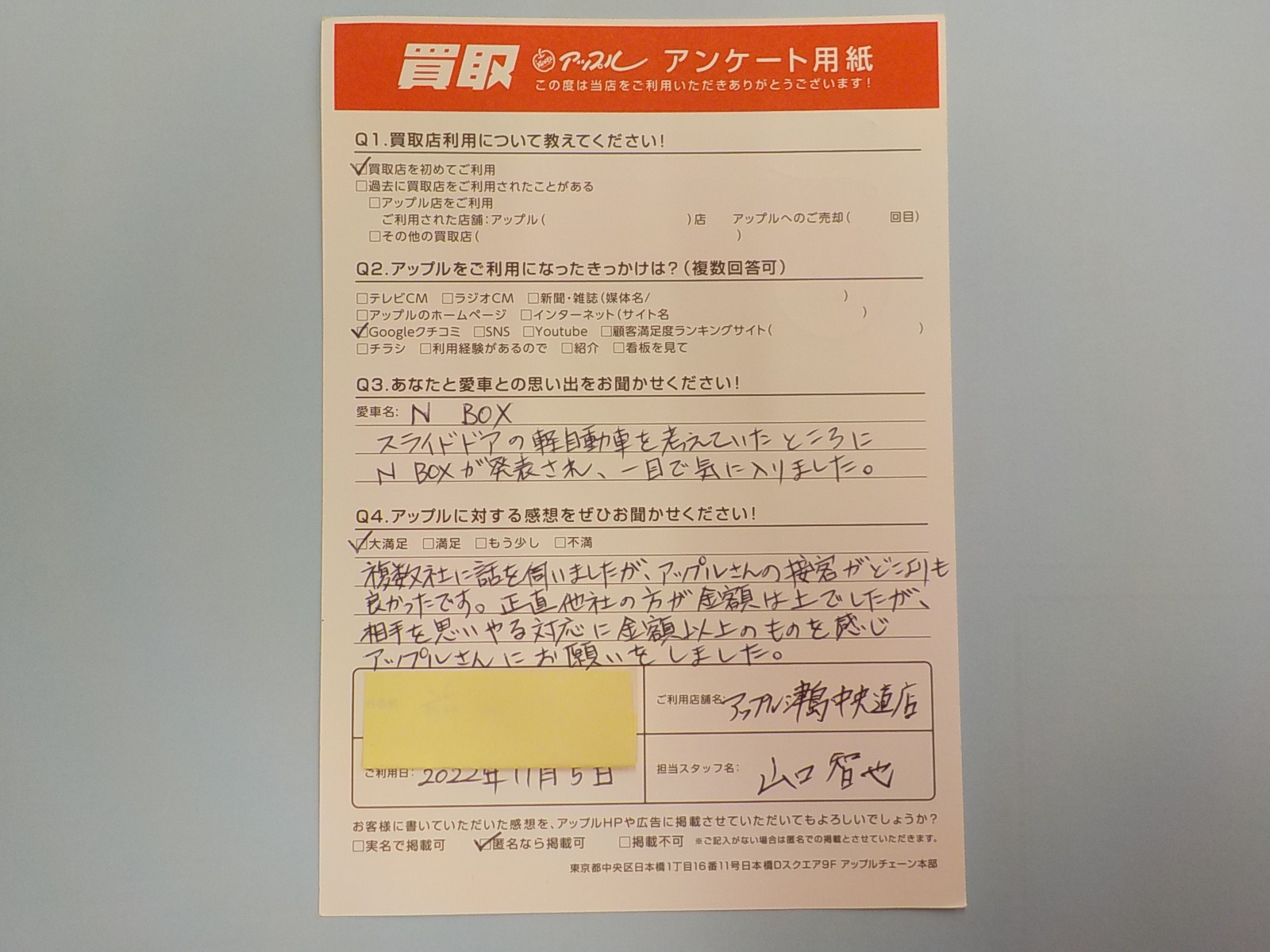 お車のご相談・ 査定だけでもOK! カンタン 入力 30秒 アップルがブランド買取始めました! お電話でも受付中! 受付時間10:00 ~ 19:00 0567-28-8151 お車のご相談・ 査定だけでもOK! カンタン 入力 30秒 アップルがブランド買取始めました! お電話でも受付中! 受付時間10:00 ~ 19:00 0567-28-8151 アップルがブランド買取始めました! お電話でも受付中! 受付時間10:00 ~ 19:00 0567-28-8151 店舗情報 在庫車 スタッフ紹介 ブログ お客様の声 キャンペーン 無料査定 click お客様の声 ご記入日: 2022/11/05 匿名(男性)様 車名:ホンダ N-BOX 複数社に話を伺いましたが、アップルさんの接客がどこよりも良かったです。正直他社の方が金額は上でしたが、相手を思いやる対応に金額以上のものを感じアップルさんにお願いをしました。 前へ 次へ お客様の声一覧を見る