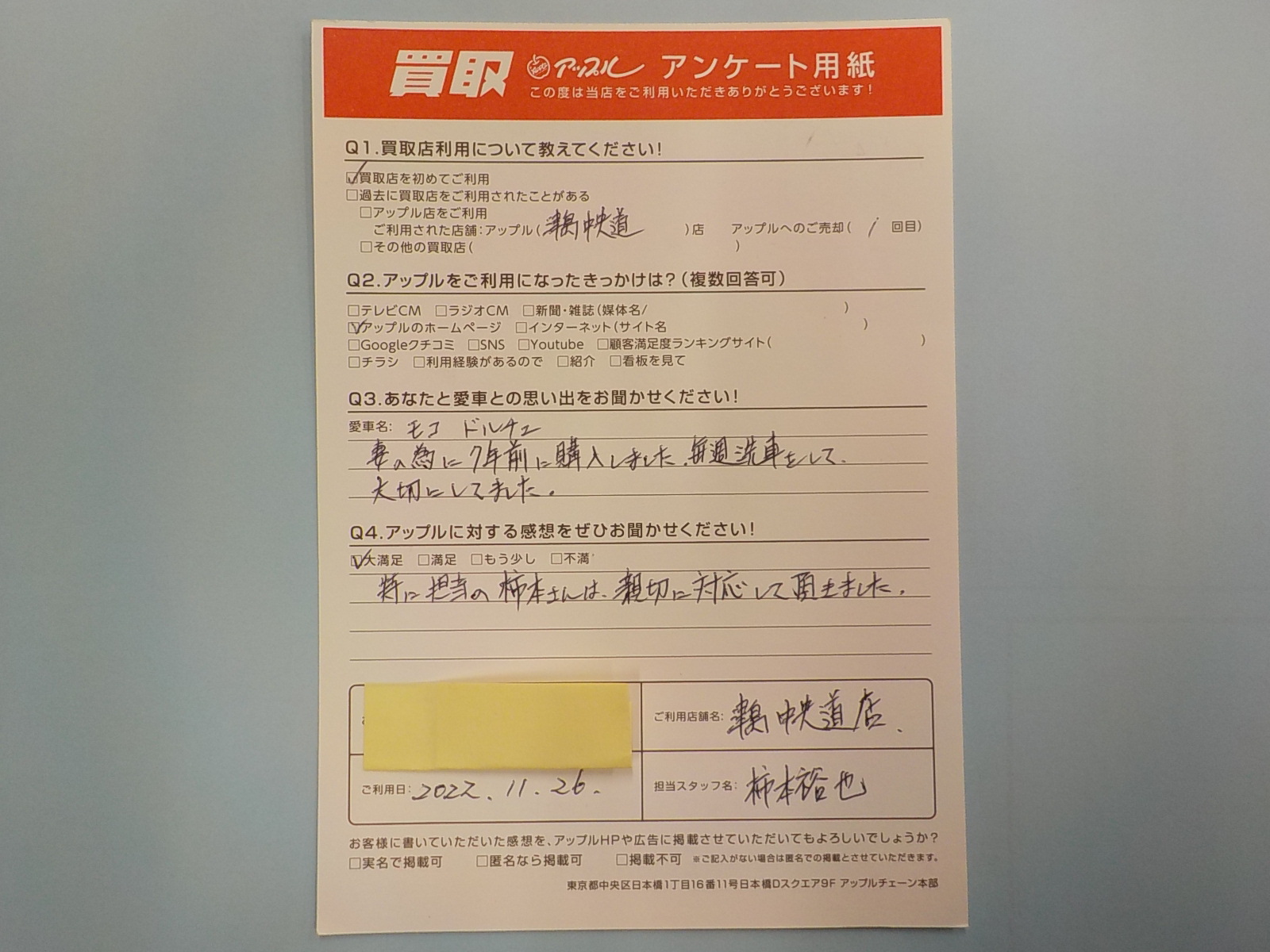 お車のご相談・ 査定だけでもOK! カンタン 入力 30秒 アップルがブランド買取始めました! お電話でも受付中! 受付時間10:00 ~ 19:00 0567-28-8151 お車のご相談・ 査定だけでもOK! カンタン 入力 30秒 アップルがブランド買取始めました! お電話でも受付中! 受付時間10:00 ~ 19:00 0567-28-8151 アップルがブランド買取始めました! お電話でも受付中! 受付時間10:00 ~ 19:00 0567-28-8151 店舗情報 在庫車 スタッフ紹介 ブログ お客様の声 キャンペーン 無料査定 click お客様の声 ご記入日: 2022/11/26 匿名(男性)様 車名:日産 モコ 特に担当の柿本さんは親切に対応して頂きました。 前へ 次へ お客様の声一覧を見る