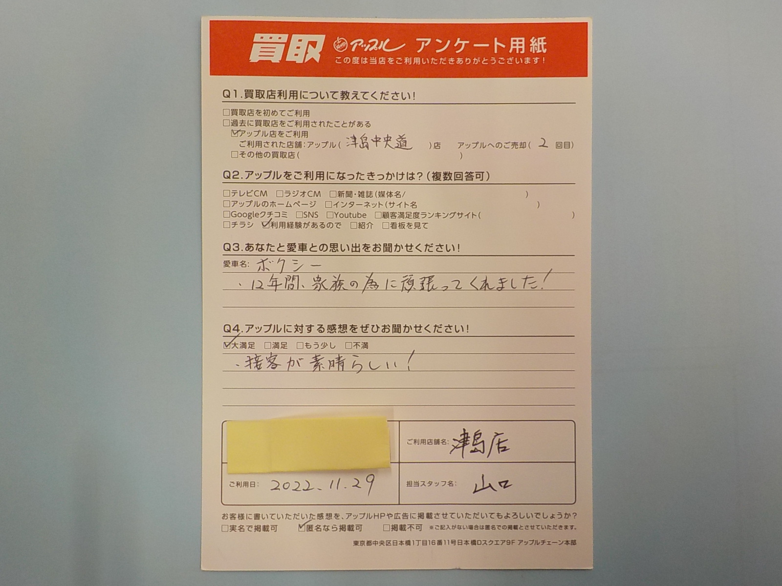 お車のご相談・ 査定だけでもOK! カンタン 入力 30秒 アップルがブランド買取始めました! お電話でも受付中! 受付時間10:00 ~ 19:00 0567-28-8151 お車のご相談・ 査定だけでもOK! カンタン 入力 30秒 アップルがブランド買取始めました! お電話でも受付中! 受付時間10:00 ~ 19:00 0567-28-8151 アップルがブランド買取始めました! お電話でも受付中! 受付時間10:00 ~ 19:00 0567-28-8151 店舗情報 在庫車 スタッフ紹介 ブログ お客様の声 キャンペーン 無料査定 click お客様の声 ご記入日: 2022/11/29 匿名(男性)様 車名:トヨタ ヴォクシー 接客が素晴らしい! 前へ 次へ お客様の声一覧を見る