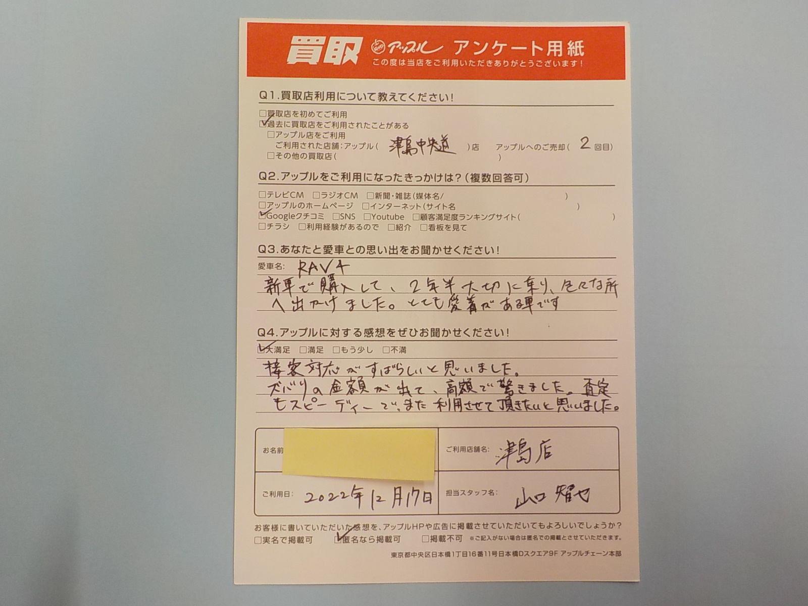 お車のご相談・ 査定だけでもOK! カンタン 入力 30秒 アップルがブランド買取始めました! お電話でも受付中! 受付時間10:00 ~ 19:00 0567-28-8151 お車のご相談・ 査定だけでもOK! カンタン 入力 30秒 アップルがブランド買取始めました! お電話でも受付中! 受付時間10:00 ~ 19:00 0567-28-8151 アップルがブランド買取始めました! お電話でも受付中! 受付時間10:00 ~ 19:00 0567-28-8151 店舗情報 在庫車 スタッフ紹介 ブログ お客様の声 キャンペーン 無料査定 click お客様の声 ご記入日: 2022/12/17 匿名(男性)様 接客対応がすばらしいと思いました。ズバリの金額が出て、高額で驚きました。査定もスピーディで、また利用させて頂きたいと思いました。 前へ 次へ お客様の声一覧を見る