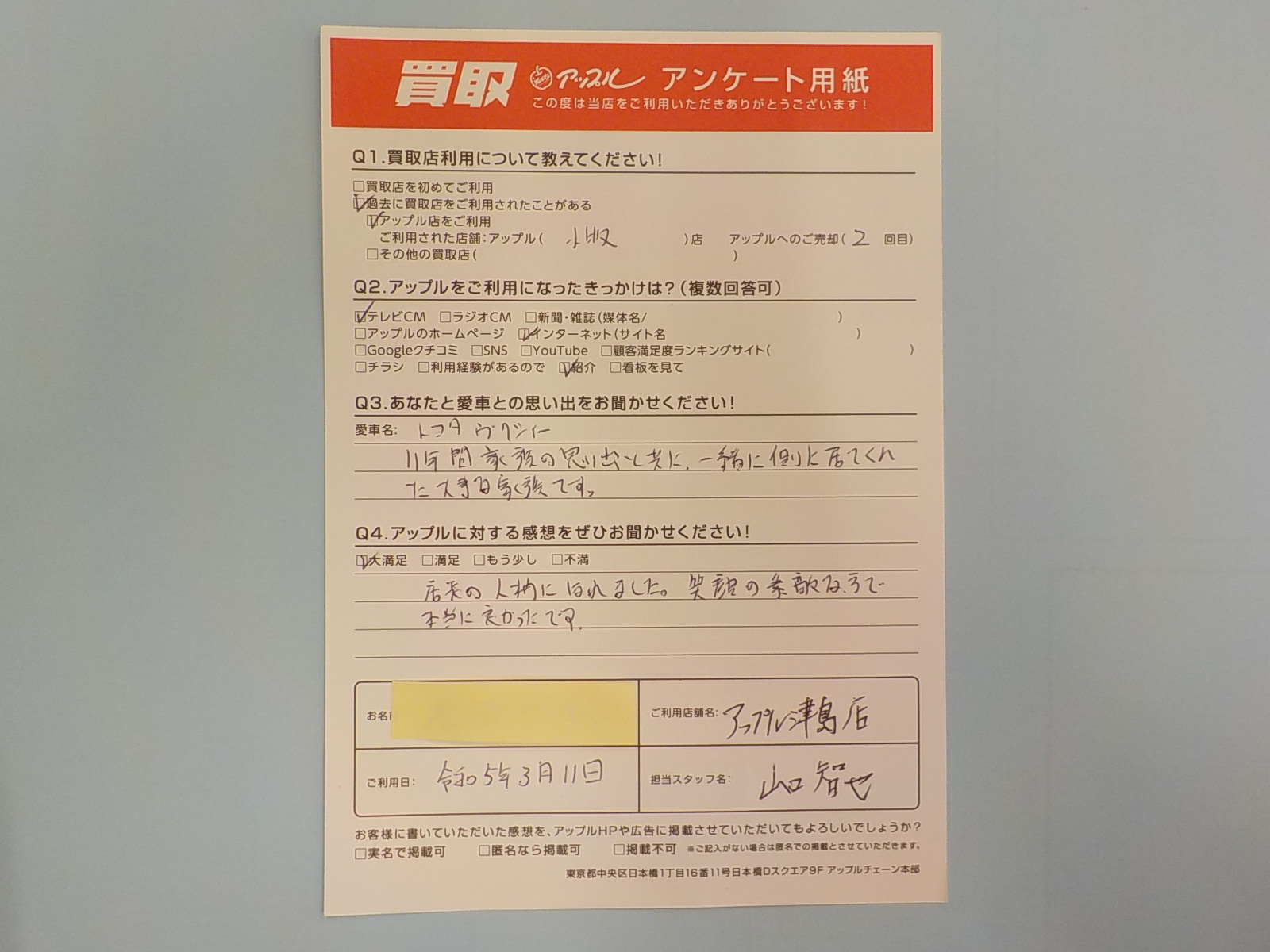 お車のご相談・ 査定だけでもOK! カンタン 入力 30秒 アップルがブランド買取始めました! お電話でも受付中! 受付時間10:00 ~ 19:00 0567-28-8151 お車のご相談・ 査定だけでもOK! カンタン 入力 30秒 アップルがブランド買取始めました! お電話でも受付中! 受付時間10:00 ~ 19:00 0567-28-8151 アップルがブランド買取始めました! お電話でも受付中! 受付時間10:00 ~ 19:00 0567-28-8151 店舗情報 在庫車 スタッフ紹介 ブログ お客様の声 キャンペーン 無料査定 click お客様の声 ご記入日: 2023/03/11 匿名(男性)様 車名:トヨタ ヴォクシー 店長の人柄にほれました。笑顔の素敵な方で本当に良かったです。 前へ 次へ お客様の声一覧を見る