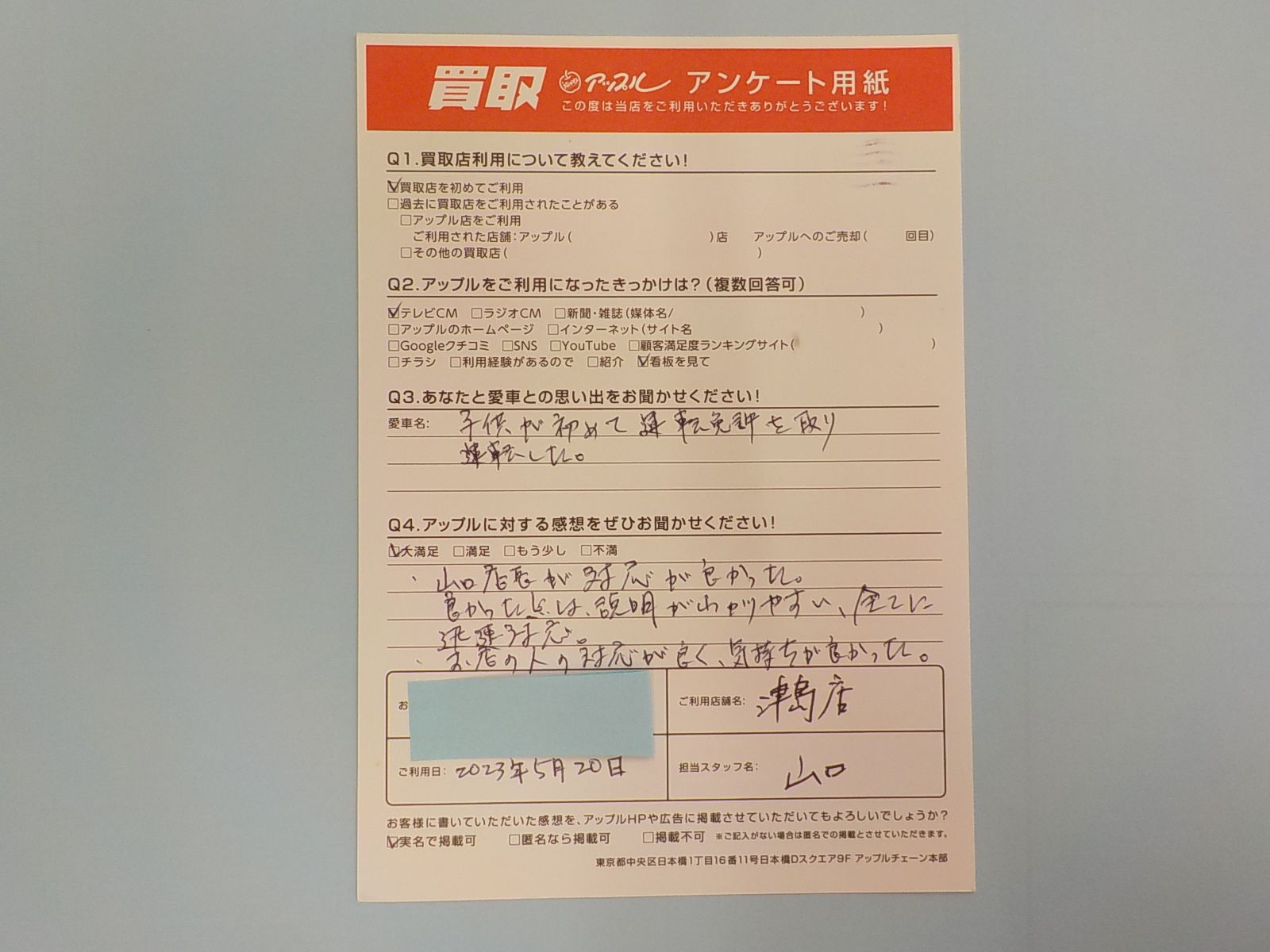 お車のご相談・ 査定だけでもOK! カンタン 入力 30秒 アップルがブランド買取始めました! お電話でも受付中! 受付時間10:00 ~ 19:00 0567-28-8151 お車のご相談・ 査定だけでもOK! カンタン 入力 30秒 アップルがブランド買取始めました! お電話でも受付中! 受付時間10:00 ~ 19:00 0567-28-8151 アップルがブランド買取始めました! お電話でも受付中! 受付時間10:00 ~ 19:00 0567-28-8151 店舗情報 在庫車 スタッフ紹介 ブログ お客様の声 キャンペーン 無料査定 click お客様の声 ご記入日: 2023/05/20 匿名(男性)様 山口店長が対応が良かった。良かった点は、説明がわかりやすい。全てに迅速対応。お店の人の対応が良く、気持ちが良かった。 前へ 次へ お客様の声一覧を見る