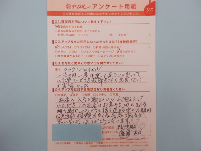 お車のご相談・ 査定だけでもOK! カンタン 入力 30秒 アップルがブランド買取始めました! お電話でも受付中! 受付時間10:00 ~ 19:00 0567-28-8151 お車のご相談・ 査定だけでもOK! カンタン 入力 30秒 アップルがブランド買取始めました! お電話でも受付中! 受付時間10:00 ~ 19:00 0567-28-8151 アップルがブランド買取始めました! お電話でも受付中! 受付時間10:00 ~ 19:00 0567-28-8151 店舗情報 在庫車 スタッフ紹介 ブログ お客様の声 キャンペーン 無料査定 click お客様の声 ご記入日: 2015/01/19 匿名様 お店に入ると感じのいいお迎えをしていただき、このお店はお客を大切にされるなと感じ、いろいろと話を進める中でも親切な対応と信頼のもてるお店であると思いました。ありがとうございます。 前へ 次へ お客様の声一覧を見る