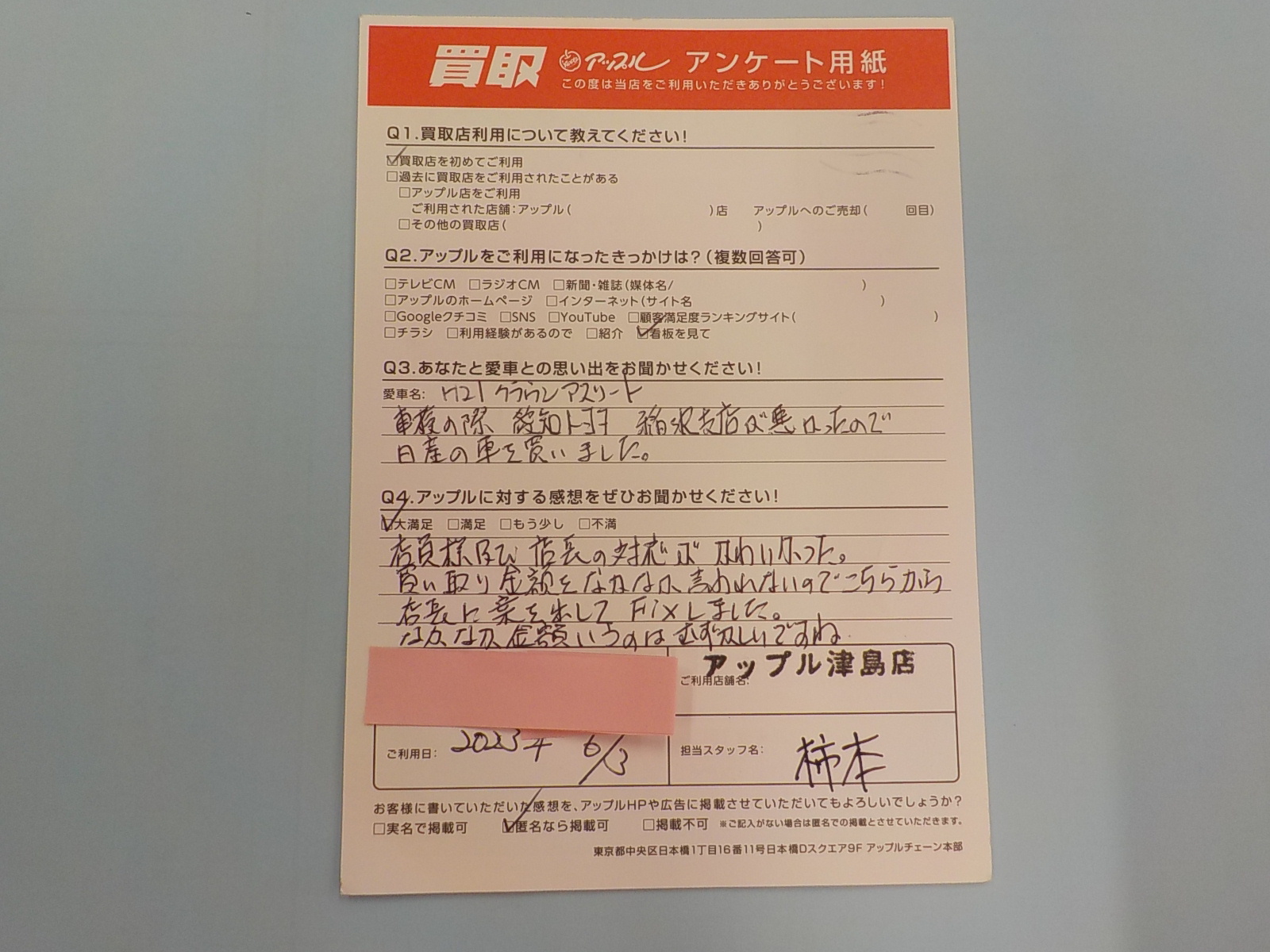 お車のご相談・ 査定だけでもOK! カンタン 入力 30秒 アップルがブランド買取始めました! お電話でも受付中! 受付時間10:00 ~ 19:00 0567-28-8151 お車のご相談・ 査定だけでもOK! カンタン 入力 30秒 アップルがブランド買取始めました! お電話でも受付中! 受付時間10:00 ~ 19:00 0567-28-8151 アップルがブランド買取始めました! お電話でも受付中! 受付時間10:00 ~ 19:00 0567-28-8151 店舗情報 在庫車 スタッフ紹介 ブログ お客様の声 キャンペーン 無料査定 click お客様の声 ご記入日: 2023/06/03 匿名様 車名:トヨタ クラウンアスリート (H11年9月~H30年6月) 店員様及び、店長の対応がかわいかった。買い取り金額をなかなか言わないのでこちらから店長に案を出してFitしました。なかなか、金額いうのはむずかしいですね。 前へ 次へ お客様の声一覧を見る