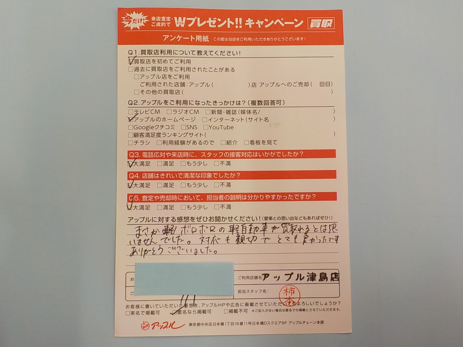 お車のご相談・ 査定だけでもOK! カンタン 入力 30秒 アップルがブランド買取始めました! お電話でも受付中! 受付時間10:00 ~ 19:00 0567-28-8151 お車のご相談・ 査定だけでもOK! カンタン 入力 30秒 アップルがブランド買取始めました! お電話でも受付中! 受付時間10:00 ~ 19:00 0567-28-8151 アップルがブランド買取始めました! お電話でも受付中! 受付時間10:00 ~ 19:00 0567-28-8151 店舗情報 在庫車 スタッフ紹介 ブログ お客様の声 キャンペーン 無料査定 click お客様の声 ご記入日: 2023/09/01 匿名(男性)様 まさかボロボロの軽自動車が買取れるとは思いませんでした。対応も親切でとても良かったです。ありがとうございました。 前へ 次へ お客様の声一覧を見る