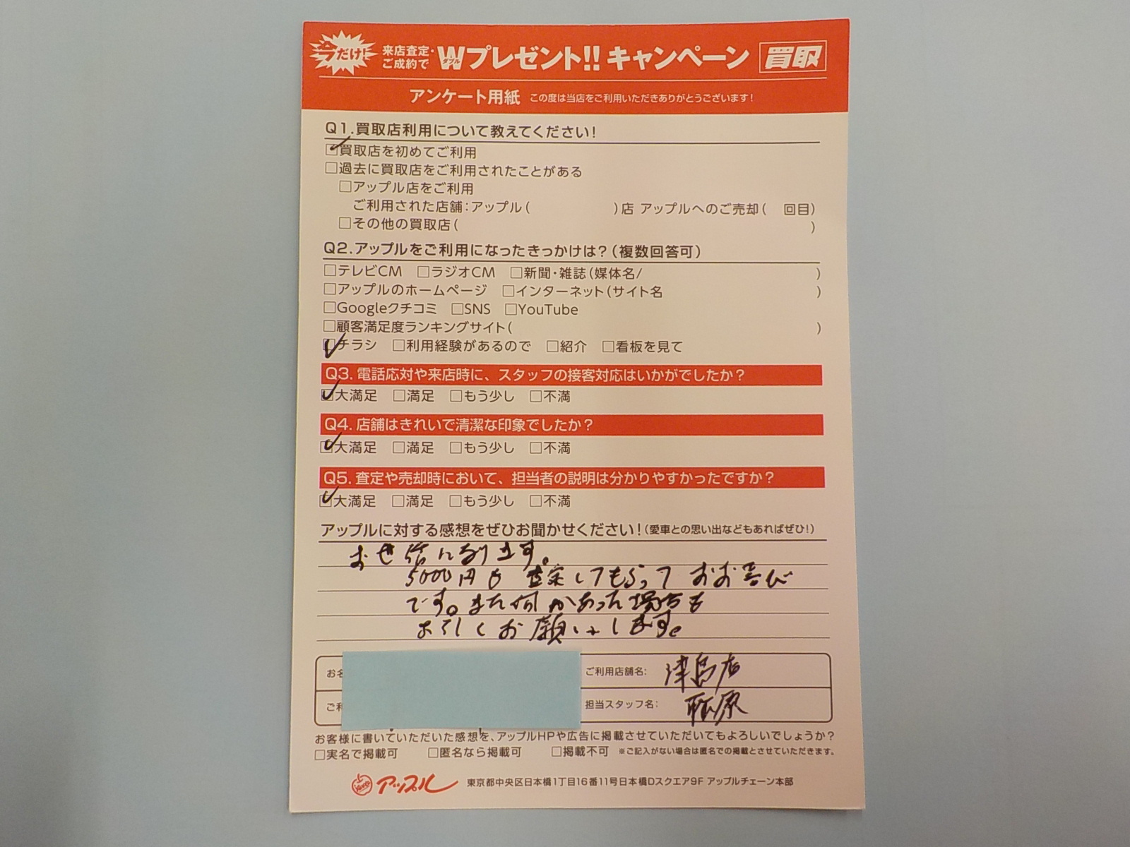 お車のご相談・ 査定だけでもOK! カンタン 入力 30秒 アップルがブランド買取始めました! お電話でも受付中! 受付時間10:00 ~ 19:00 0567-28-8151 お車のご相談・ 査定だけでもOK! カンタン 入力 30秒 アップルがブランド買取始めました! お電話でも受付中! 受付時間10:00 ~ 19:00 0567-28-8151 アップルがブランド買取始めました! お電話でも受付中! 受付時間10:00 ~ 19:00 0567-28-8151 店舗情報 在庫車 スタッフ紹介 ブログ お客様の声 キャンペーン 無料査定 click お客様の声 ご記入日: 2023/09/04 匿名(男性)様 お世話になります。5000円も査定してもらって大喜びです。また何かあった場合もよろしくお願いします。 前へ 次へ お客様の声一覧を見る