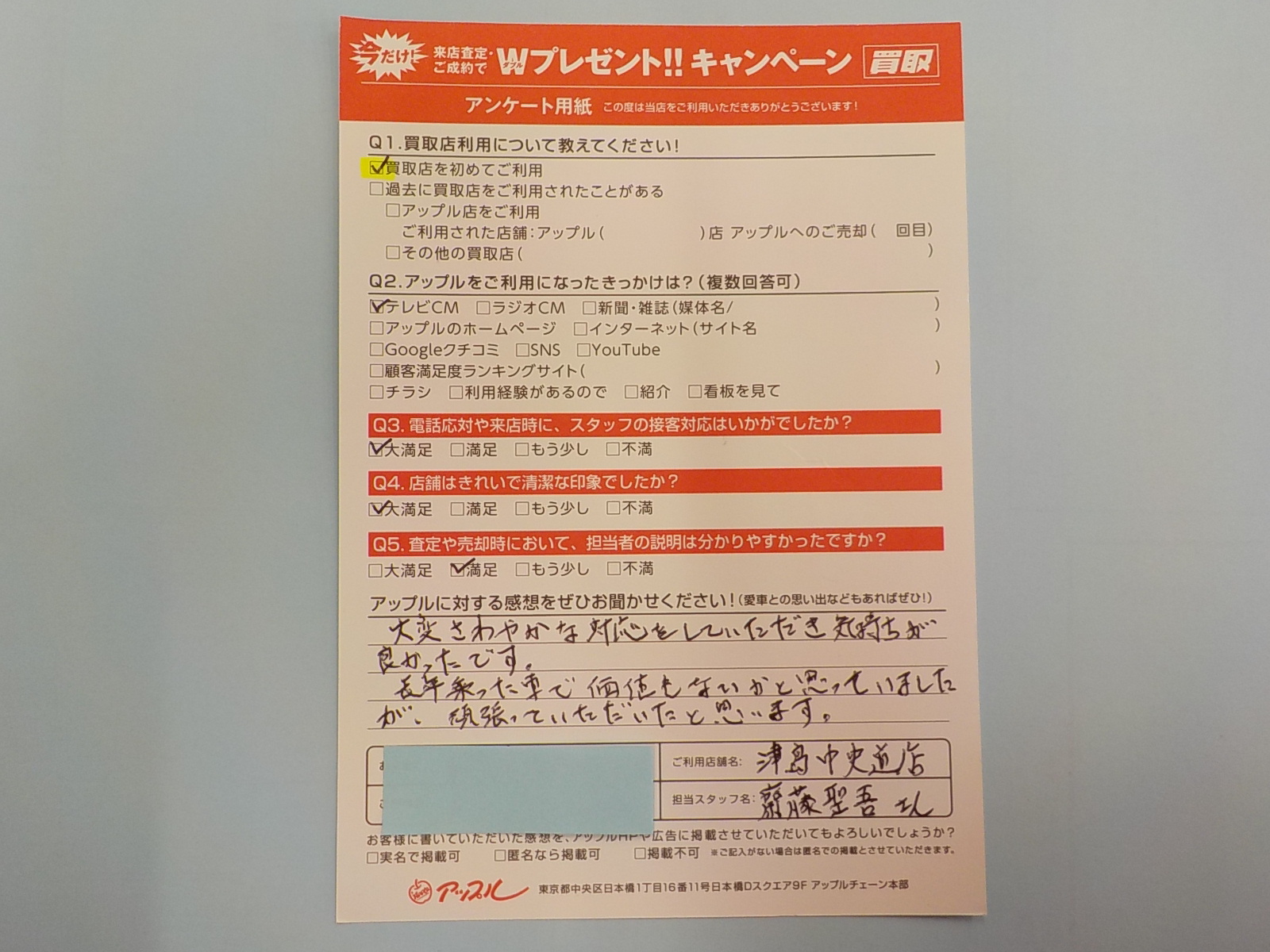 お車のご相談・ 査定だけでもOK! カンタン 入力 30秒 アップルがブランド買取始めました! お電話でも受付中! 受付時間10:00 ~ 19:00 0567-28-8151 お車のご相談・ 査定だけでもOK! カンタン 入力 30秒 アップルがブランド買取始めました! お電話でも受付中! 受付時間10:00 ~ 19:00 0567-28-8151 アップルがブランド買取始めました! お電話でも受付中! 受付時間10:00 ~ 19:00 0567-28-8151 店舗情報 在庫車 スタッフ紹介 ブログ お客様の声 キャンペーン 無料査定 click お客様の声 ご記入日: 2023/09/14 匿名(男性)様 大変さわやかな対応をしていただき気持ちが良かったです。長年乗った車で価値もないかと思っていましたが、頑張っていただいたと思います。 前へ 次へ お客様の声一覧を見る