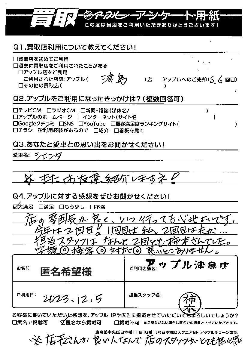 ご利用:2023年12月5日 タント: 柿本