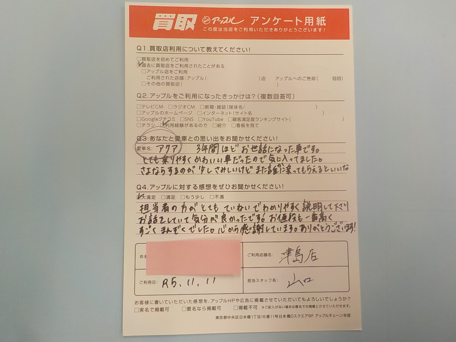 お車のご相談・ 査定だけでもOK! カンタン 入力 30秒 アップルがブランド買取始めました! お電話でも受付中! 受付時間10:00 ~ 19:00 0567-28-8151 お車のご相談・ 査定だけでもOK! カンタン 入力 30秒 アップルがブランド買取始めました! お電話でも受付中! 受付時間10:00 ~ 19:00 0567-28-8151 アップルがブランド買取始めました! お電話でも受付中! 受付時間10:00 ~ 19:00 0567-28-8151 店舗情報 在庫車 スタッフ紹介 ブログ お客様の声 キャンペーン 無料査定 click お客様の声 ご記入日: 2023/11/11 匿名(女性)様 担当者の方がとてもていねいでわかりやすく説明して下さりお話をしていて気分が良かったです!お値段も一番高くすごくまんぞくでした。心から感謝しています。ありがとうございます! 前へ 次へ お客様の声一覧を見る