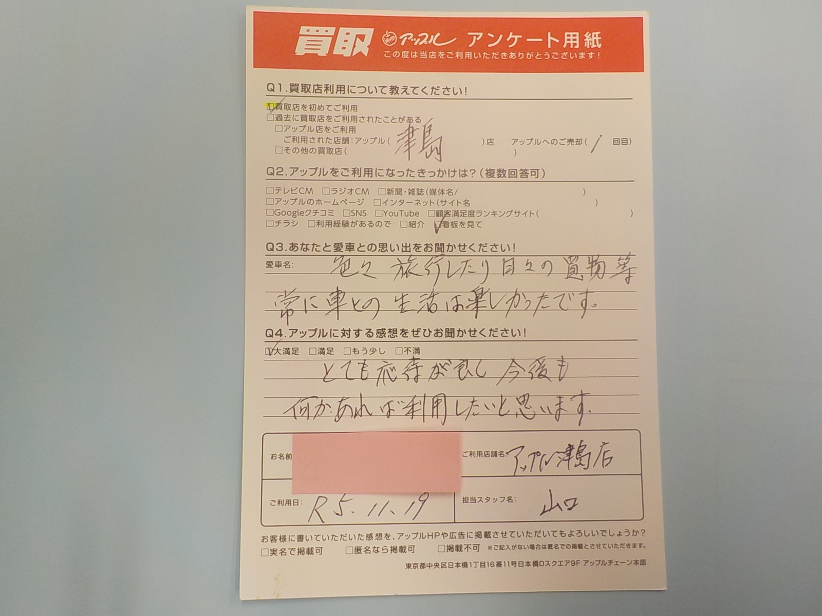 お車のご相談・ 査定だけでもOK! カンタン 入力 30秒 アップルがブランド買取始めました! お電話でも受付中! 受付時間10:00 ~ 19:00 0567-28-8151 お車のご相談・ 査定だけでもOK! カンタン 入力 30秒 アップルがブランド買取始めました! お電話でも受付中! 受付時間10:00 ~ 19:00 0567-28-8151 アップルがブランド買取始めました! お電話でも受付中! 受付時間10:00 ~ 19:00 0567-28-8151 店舗情報 在庫車 スタッフ紹介 ブログ お客様の声 キャンペーン 無料査定 click お客様の声 ご記入日: 2023/11/19 匿名(男性)様 とても応対が良く今後も何かあれば利用したいと思います。 前へ 次へ お客様の声一覧を見る