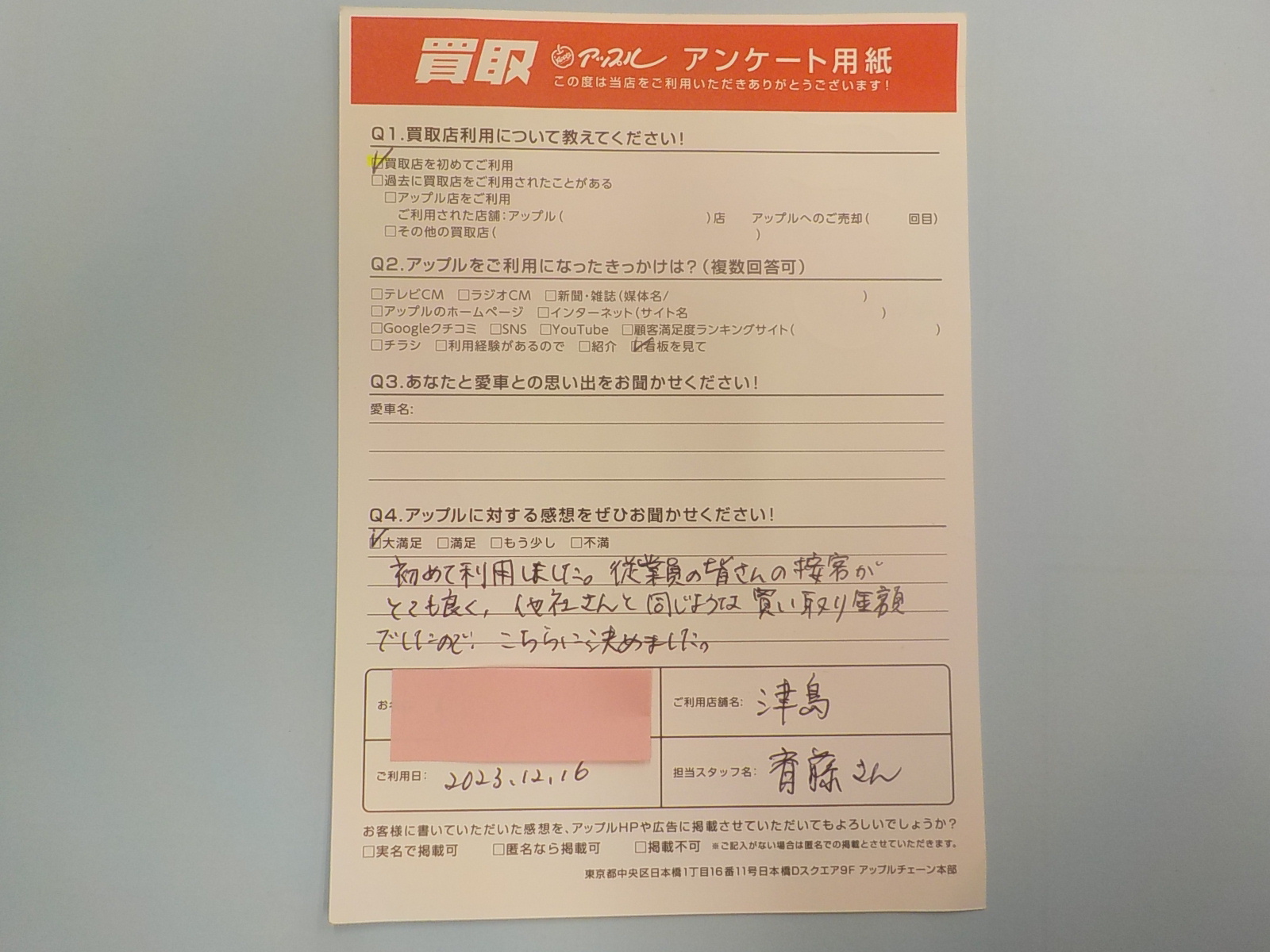 お車のご相談・ 査定だけでもOK! カンタン 入力 30秒 アップルがブランド買取始めました! お電話でも受付中! 受付時間10:00 ~ 19:00 0567-28-8151 お車のご相談・ 査定だけでもOK! カンタン 入力 30秒 アップルがブランド買取始めました! お電話でも受付中! 受付時間10:00 ~ 19:00 0567-28-8151 アップルがブランド買取始めました! お電話でも受付中! 受付時間10:00 ~ 19:00 0567-28-8151 店舗情報 在庫車 スタッフ紹介 ブログ お客様の声 キャンペーン 無料査定 click お客様の声 ご記入日: 2023/12/16 匿名(女性)様 初めて利用しました。従業員の皆さんの接客がとても良く、他社さんと同じような買い取り金額でしたので、こちらに決めました。 前へ 次へ お客様の声一覧を見る