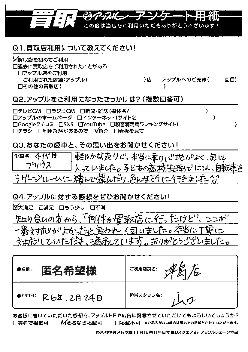 匿名希望様 車名:トヨタ プリウス(2023年3月~のPHVを含む)