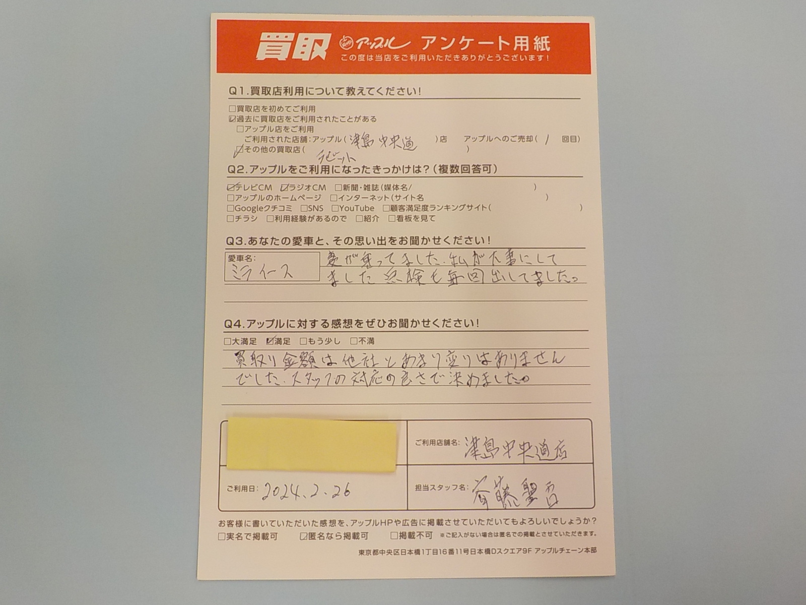お車のご相談・ 査定だけでもOK! カンタン 入力 30秒 アップルがブランド買取始めました! お電話でも受付中! 受付時間10:00 ~ 19:00 0567-28-8151 お車のご相談・ 査定だけでもOK! カンタン 入力 30秒 アップルがブランド買取始めました! お電話でも受付中! 受付時間10:00 ~ 19:00 0567-28-8151 アップルがブランド買取始めました! お電話でも受付中! 受付時間10:00 ~ 19:00 0567-28-8151 店舗情報 在庫車 スタッフ紹介 ブログ お客様の声 キャンペーン 無料査定 click お客様の声 ご記入日: 2024/02/26 匿名(男性)様 買取り金額は他社とあまり変わりはありませんでした。スタッフの対応の良さで決まました。 前へ 次へ お客様の声一覧を見る