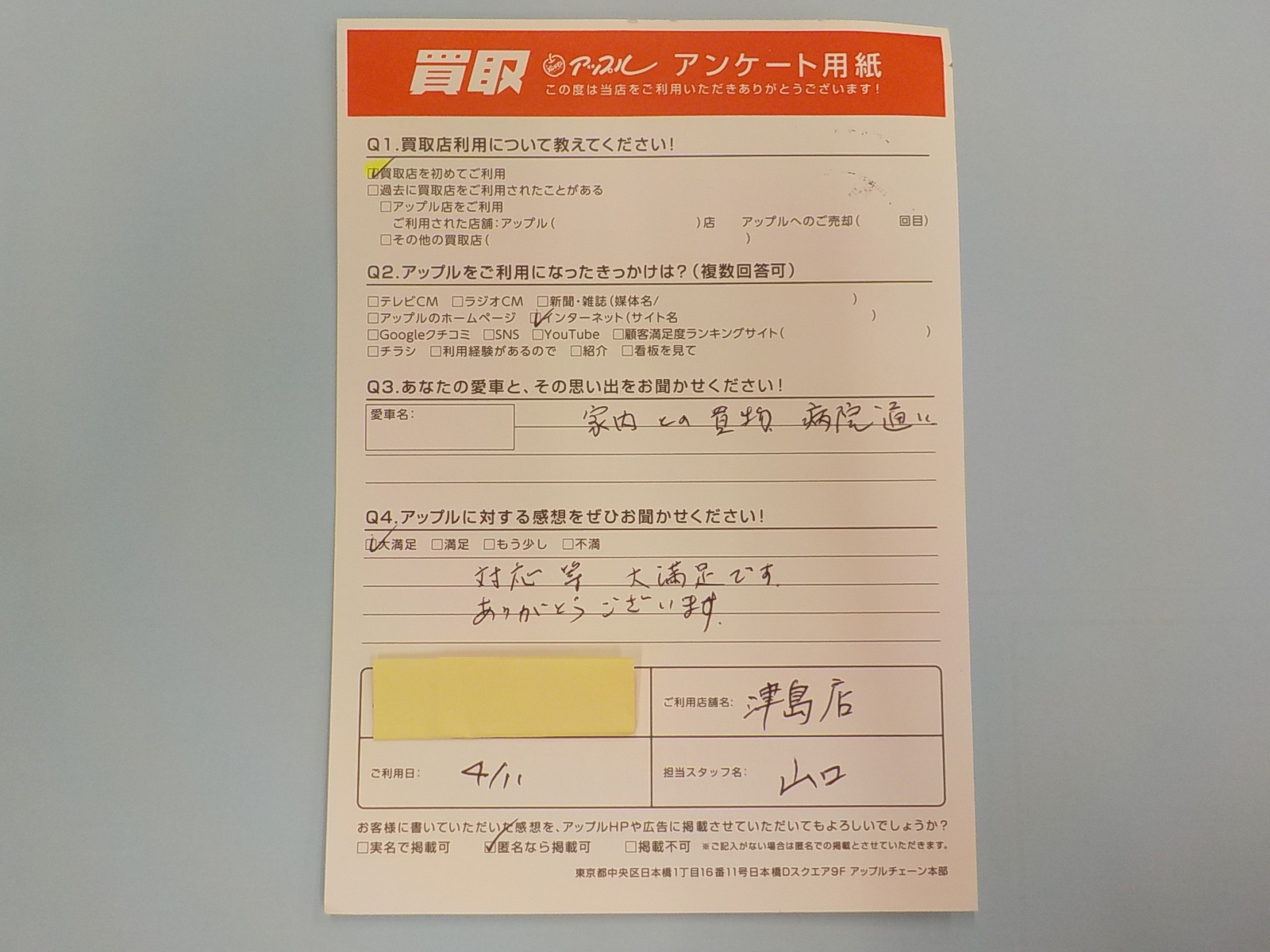 お車のご相談・ 査定だけでもOK! カンタン 入力 30秒 アップルがブランド買取始めました! お電話でも受付中! 受付時間10:00 ~ 19:00 0567-28-8151 お車のご相談・ 査定だけでもOK! カンタン 入力 30秒 アップルがブランド買取始めました! お電話でも受付中! 受付時間10:00 ~ 19:00 0567-28-8151 アップルがブランド買取始めました! お電話でも受付中! 受付時間10:00 ~ 19:00 0567-28-8151 店舗情報 在庫車 スタッフ紹介 ブログ お客様の声 キャンペーン 無料査定 click お客様の声 ご記入日: 2024/04/11 匿名(男性)様 対応等 大満足です。ありがとうございます。 前へ 次へ お客様の声一覧を見る