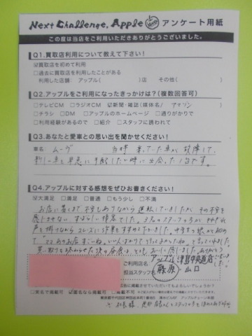 お店に着くまで不安もありながら運転していましたが、その不安を感じさせないすばらしい接客でした。3名のスタッフの方が、それぞれ声を掛けながらスムーズに作業をすすめて下さいました。中学生の娘が初めて「ママあの店すごいね。いい人ばかりで行ってよかったね。」と言ってくれました。買い取りを終わらせた後の昼食は、とてもおいしく感じました。ありがとうございました!