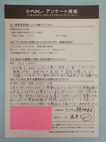 2名のスタッフの方の対応に感動しました。おふたりとも移動の際は必ず走ってテキパキと仕事をこなし客を待たせない心遣いを感じました。特に担当の山口さんは私達が大切にしてきた愛車の為めいっぱいの買取価格で頑張ってくれたので、このお店しかないと決めました。何事も一生懸命なお店づくりが決め手でした。
