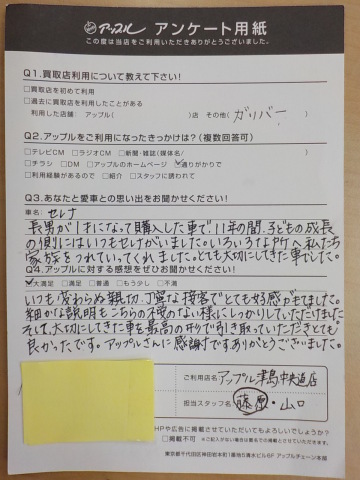 いつも変わらぬ親切・丁寧な接客でとても好感がもてました。細かな説明もこちらの不安のない様にしっかりしていただきました。そして、大切にしてきた車を最高の形で引き取っていただきとても良かったです。アップルさんに感謝です。ありがとうございました。