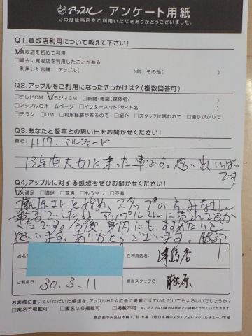 お車のご相談・ 査定だけでもOK! カンタン 入力 30秒 アップルがブランド買取始めました! お電話でも受付中! 受付時間10:00 ~ 19:00 0567-28-8151 お車のご相談・ 査定だけでもOK! カンタン 入力 30秒 アップルがブランド買取始めました! お電話でも受付中! 受付時間10:00 ~ 19:00 0567-28-8151 アップルがブランド買取始めました! お電話でも受付中! 受付時間10:00 ~ 19:00 0567-28-8151 店舗情報 在庫車 スタッフ紹介 ブログ お客様の声 キャンペーン 無料査定 click お客様の声 ご記入日: 2018/03/11 匿名様 藤原さんを始め、スタッフの方みなさん最高でした!!アップルさんに売れて良かったです。今後、身内にもすすめたいと思います。ありがとうございます。 前へ 次へ お客様の声一覧を見る