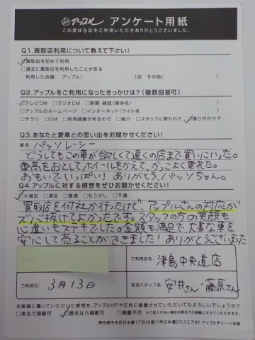 お車のご相談・ 査定だけでもOK! カンタン 入力 30秒 アップルがブランド買取始めました! お電話でも受付中! 受付時間10:00 ~ 19:00 0567-28-8151 お車のご相談・ 査定だけでもOK! カンタン 入力 30秒 アップルがブランド買取始めました! お電話でも受付中! 受付時間10:00 ~ 19:00 0567-28-8151 アップルがブランド買取始めました! お電話でも受付中! 受付時間10:00 ~ 19:00 0567-28-8151 店舗情報 在庫車 スタッフ紹介 ブログ お客様の声 キャンペーン 無料査定 click お客様の声 ご記入日: 2018/03/13 匿名様 買取店を何社か行ったけどアップルさんの対応がズバ抜けてよかったです。スタッフの方の笑顔も心遣いもステキでした。金額も満足で大事な車を安心して売ることが出来ました!ありがとうございました。 前へ 次へ お客様の声一覧を見る