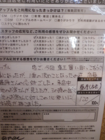 お車のご相談・ 査定だけでもOK! カンタン 入力 30秒 アップルがブランド買取始めました! お電話でも受付中! 受付時間10:00 ~ 19:00 0567-28-8151 お車のご相談・ 査定だけでもOK! カンタン 入力 30秒 アップルがブランド買取始めました! お電話でも受付中! 受付時間10:00 ~ 19:00 0567-28-8151 アップルがブランド買取始めました! お電話でも受付中! 受付時間10:00 ~ 19:00 0567-28-8151 店舗情報 在庫車 スタッフ紹介 ブログ お客様の声 キャンペーン 無料査定 click お客様の声 ご記入日: 2012/10/04 匿名希望様 アップルで今回買い取ってもらう事になったが、1番の決めてとなったのは店長 藤原さん の対応でした。来客中他のお客さんがみえたが、その時の自分と他のお客さんに対しての心遣いに好感が持てました。 前へ 次へ お客様の声一覧を見る
