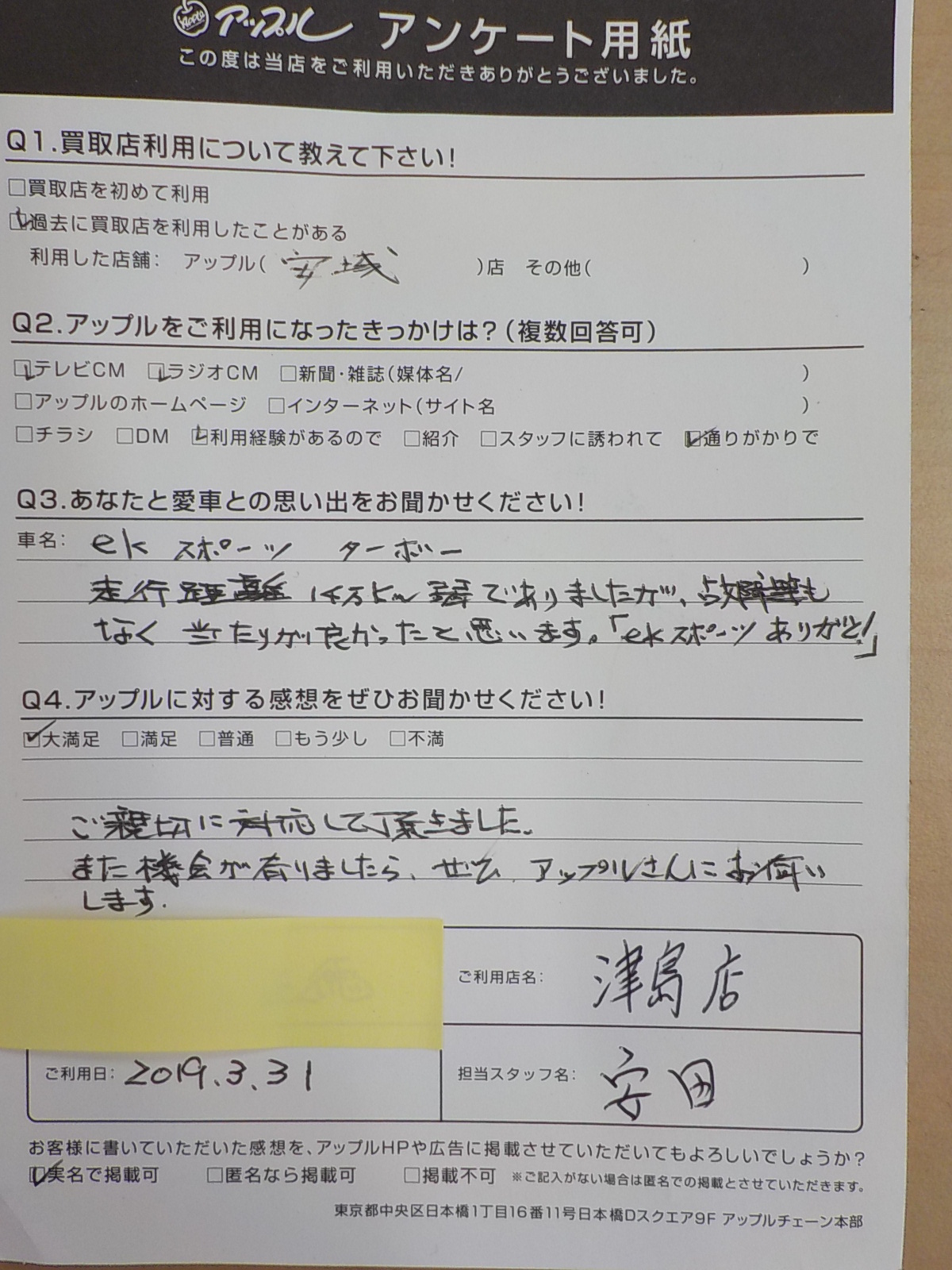 お車のご相談・ 査定だけでもOK! カンタン 入力 30秒 アップルがブランド買取始めました! お電話でも受付中! 受付時間10:00 ~ 19:00 0567-28-8151 お車のご相談・ 査定だけでもOK! カンタン 入力 30秒 アップルがブランド買取始めました! お電話でも受付中! 受付時間10:00 ~ 19:00 0567-28-8151 アップルがブランド買取始めました! お電話でも受付中! 受付時間10:00 ~ 19:00 0567-28-8151 店舗情報 在庫車 スタッフ紹介 ブログ お客様の声 キャンペーン 無料査定 click お客様の声 ご記入日: 2019/03/31 愛知県津島市 匿名様 車名:三菱 eKスポーツ ご親切に対応頂きました。また機会がありましたら、ぜひ、アップルさんにお伺いします。 前へ 次へ お客様の声一覧を見る