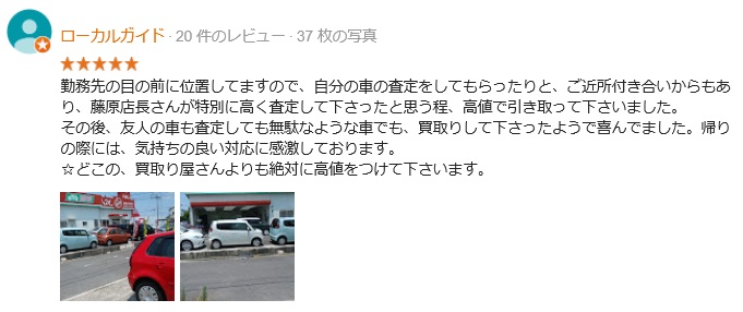勤務先の目の前に位置していますので、自分の車の査定をしてもらったりと、ご近所付き合いからもあり、藤原店長さんが特別に高く査定して下さったと思う程、高値で引き取って下さいました。その後、友人の車も査定しても無駄なような車でも、買取りして下さったようで喜んでました。帰りの際には気持ちの良い対応に感激しております。★どこの、買取り屋さんよりも絶対高値をつけて下さいます。