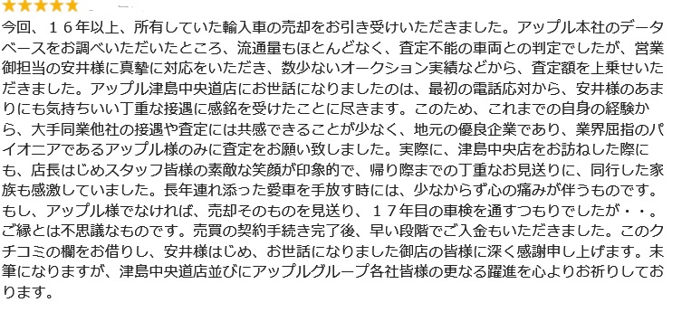お調べいただいたところ、流通量もほとんどなく、査定不能の車両との判定でしたが、営業担当の安井様に真摯に対応をいただき、数少ないオークション実績などから、査定額を上乗せいただきました。アップル津島中央道店にお世話になりましたのは、最初の電話応対から、安井さあのあまりにも気持ちいい丁重な接遇に感銘を受けた事に尽きます。このため、これまでの自身の経験から、大手同業他社の接遇や査定には共感出来る事が少なく、実際に有料企業であり、業界屈指のパイオニアであるアップル様のみに査定をお願い致しました。実際に、津島中央店をおたずねした際にも、店長はじめスタッフの皆様の素敵な笑顔が印象的で、帰り際まで丁重なお見送りに、同行した家族も感激していました。長年連れ添った愛車を手放す時には、少なからず心の痛みが伴うものです。もし、アップル様でなければ、売却そのものを見送り、17年目の車検を通すつもりでしたが…。ご縁とは不思議なものです。売買の契約手続き完了後、早い段階でご入金もいただきました。このクチコミの欄をお借りし、安井様はじめ、お世話になりました御店の皆様に深く感謝申し上げます。末筆になりますが、津島中央道店並びにアップルグループ各社皆様の更なる躍進を心よりお祈りしております。