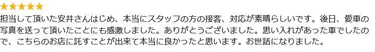 担当して頂いた安井さんはじめ、本当にスタッフの方の接客、対応が素晴らしいです。後日愛車の写真を送って頂いたことにも感激しました。ありがとうございました。思い入れがあった車でしたので、こちらのお店に託すことが出来て本当に良かったと思います。お世話になりました。