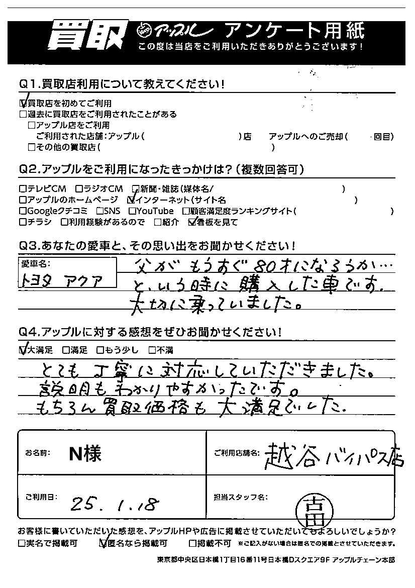 お車のご相談・ 査定だけでもOK! カンタン 入力 30秒 アップルがブランド買取始めました! お電話でも受付中! 受付時間10:00~18:00 048-963-6311 お車のご相談・ 査定だけでもOK! カンタン 入力 30秒 アップルがブランド買取始めました! お電話でも受付中! 受付時間10:00~18:00 048-963-6311 アップルがブランド買取始めました! お電話でも受付中! 受付時間10:00~18:00 048-963-6311 店舗情報 在庫車 スタッフ紹介 ブログ お客様の声 キャンペーン お得 無料査定 click お客様の声 ご記入日: 2025/01/18 N様 車名:トヨタ アクア 父がもうすぐ80才になろうか・・・という時に購入した車です。大切に乗っていました。とても丁寧に対応していただきました。説明もわかりやすかったです。もちろん買取価格も大満足でした。 前へ 次へ お客様の声一覧を見る