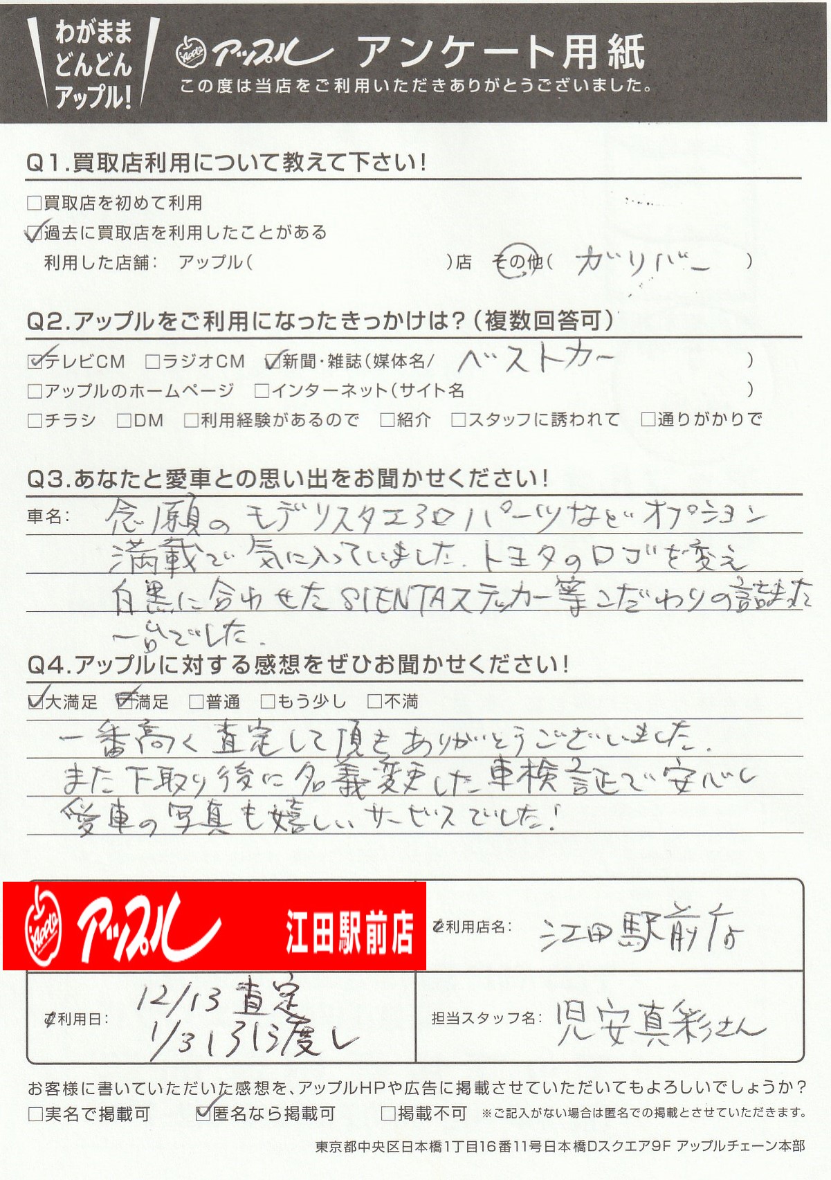 一番高く査定して頂き、ありがとうございました。