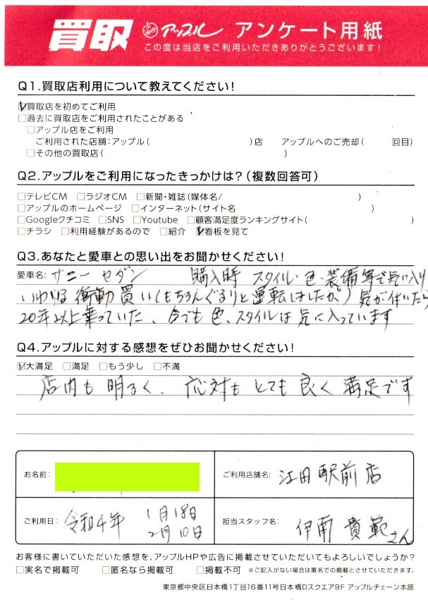 お車のご相談・ 査定だけでもOK! カンタン 入力 30秒 アップルがブランド買取始めました! お電話でも受付中! 受付時間10:00 ~ 19:00 045-912-7560 お車のご相談・ 査定だけでもOK! カンタン 入力 30秒 アップルがブランド買取始めました! お電話でも受付中! 受付時間10:00 ~ 19:00 045-912-7560 アップルがブランド買取始めました! お電話でも受付中! 受付時間10:00 ~ 19:00 045-912-7560 店舗情報 在庫車 スタッフ紹介 ブログ お客様の声 キャンペーン 無料査定 click お客様の声 ご記入日: 2022/02/10 M様 車名:日産 サニー(セダン) 店内も明るく、対応もとても良く満足です。 前へ 次へ お客様の声一覧を見る