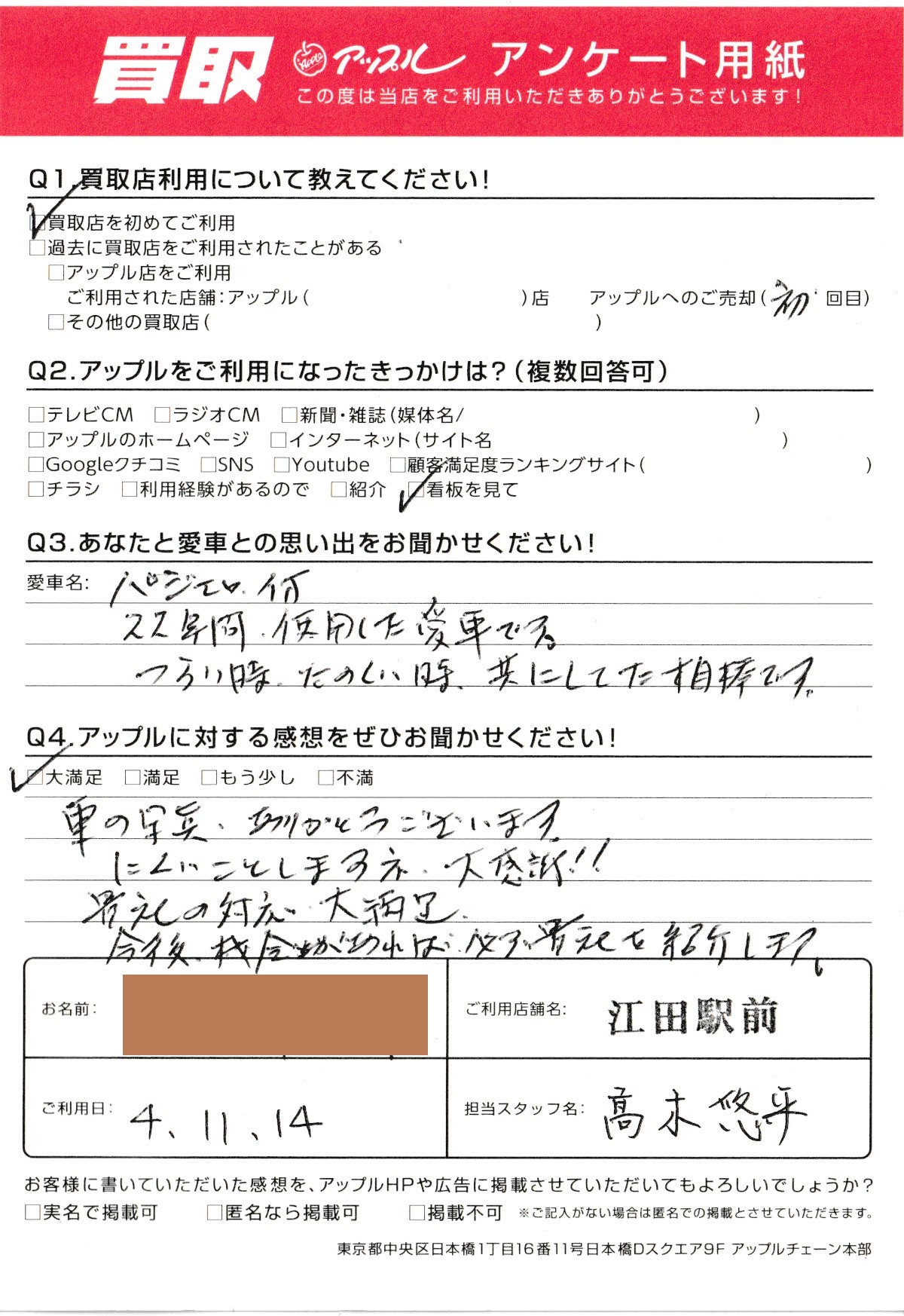 お車のご相談・ 査定だけでもOK! カンタン 入力 30秒 アップルがブランド買取始めました! お電話でも受付中! 受付時間10:00 ~ 19:00 045-912-7560 お車のご相談・ 査定だけでもOK! カンタン 入力 30秒 アップルがブランド買取始めました! お電話でも受付中! 受付時間10:00 ~ 19:00 045-912-7560 アップルがブランド買取始めました! お電話でも受付中! 受付時間10:00 ~ 19:00 045-912-7560 店舗情報 在庫車 スタッフ紹介 ブログ お客様の声 キャンペーン 無料査定 click お客様の声 ご記入日: 2022/11/14 O様 車名:三菱 パジェロイオ 車の写真ありがとうございます。にくいことをしますネ、大感謝!!貴社の対応、大満足。今後、機会があれば、必ず貴社を紹介します。 前へ 次へ お客様の声一覧を見る