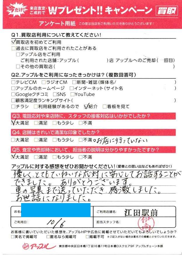 お車のご相談・ 査定だけでもOK! カンタン 入力 30秒 アップルがブランド買取始めました! お電話でも受付中! 受付時間10:00 ~ 19:00 045-912-7560 お車のご相談・ 査定だけでもOK! カンタン 入力 30秒 アップルがブランド買取始めました! お電話でも受付中! 受付時間10:00 ~ 19:00 045-912-7560 アップルがブランド買取始めました! お電話でも受付中! 受付時間10:00 ~ 19:00 045-912-7560 店舗情報 在庫車 スタッフ紹介 ブログ お客様の声 キャンペーン 無料査定 click お客様の声 ご記入日: 2023/10/06 F様 車名:スズキ ハスラー 優しく、とてもていねいな対応に安心してお話しすることができました。ありがとうございます。車の写真まで送っていただき、感激しました。お世話になりました。 前へ 次へ お客様の声一覧を見る