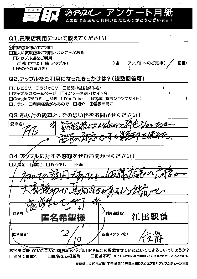匿名希望様 車名:ホンダ フィット(H25年9月以降のハイブリッド含む)