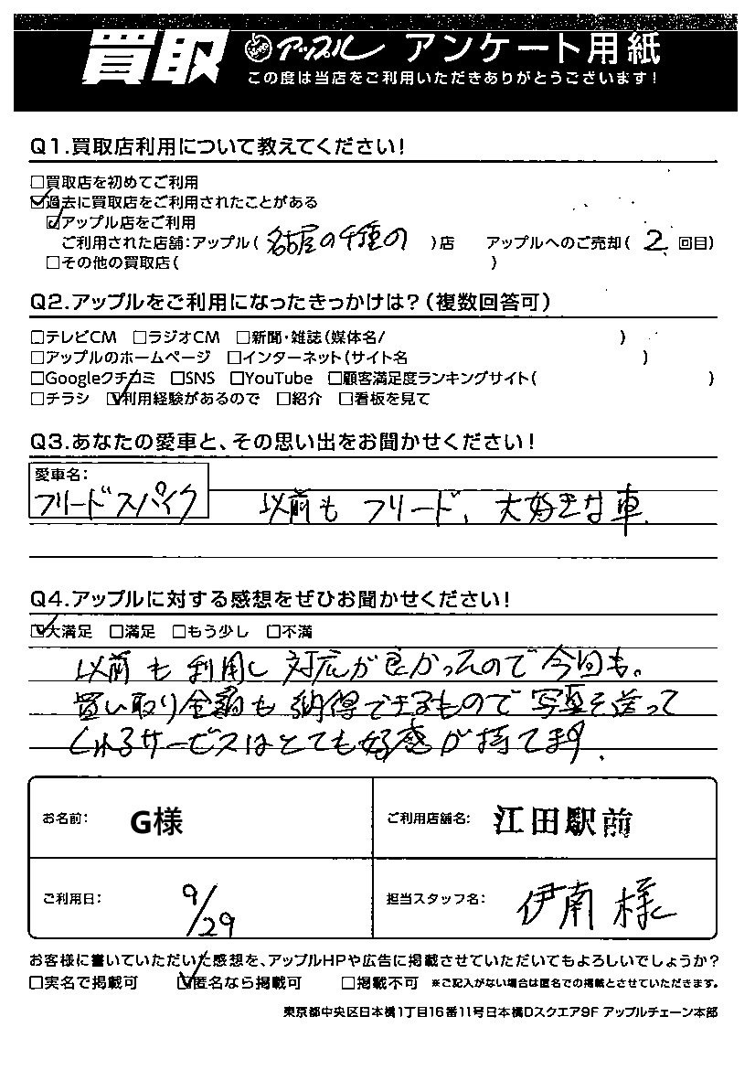 G様 車名:ホンダ フリードスパイク